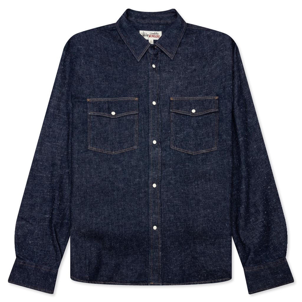 Stussy introduces the Boxy Western Denim L/S Shirt. This shirt is constructed from garment-washed cotton denim. It features off-white pearl snaps on the topstitched placket, pockets, and cuffs. Finishing touches include a Stussy stock flag label stitched at the side seam. It features off-white pearl snaps on the topstitched placket, pockets, and cuffs. Finishing touches include a Stussy stock flag label stitched at the side seam. - 100% Cotton - Denim construction - Collared neckline - Snap button closure - Patch chest pockets - Back yoke - Curved hem - Style No: 1110320-DADE