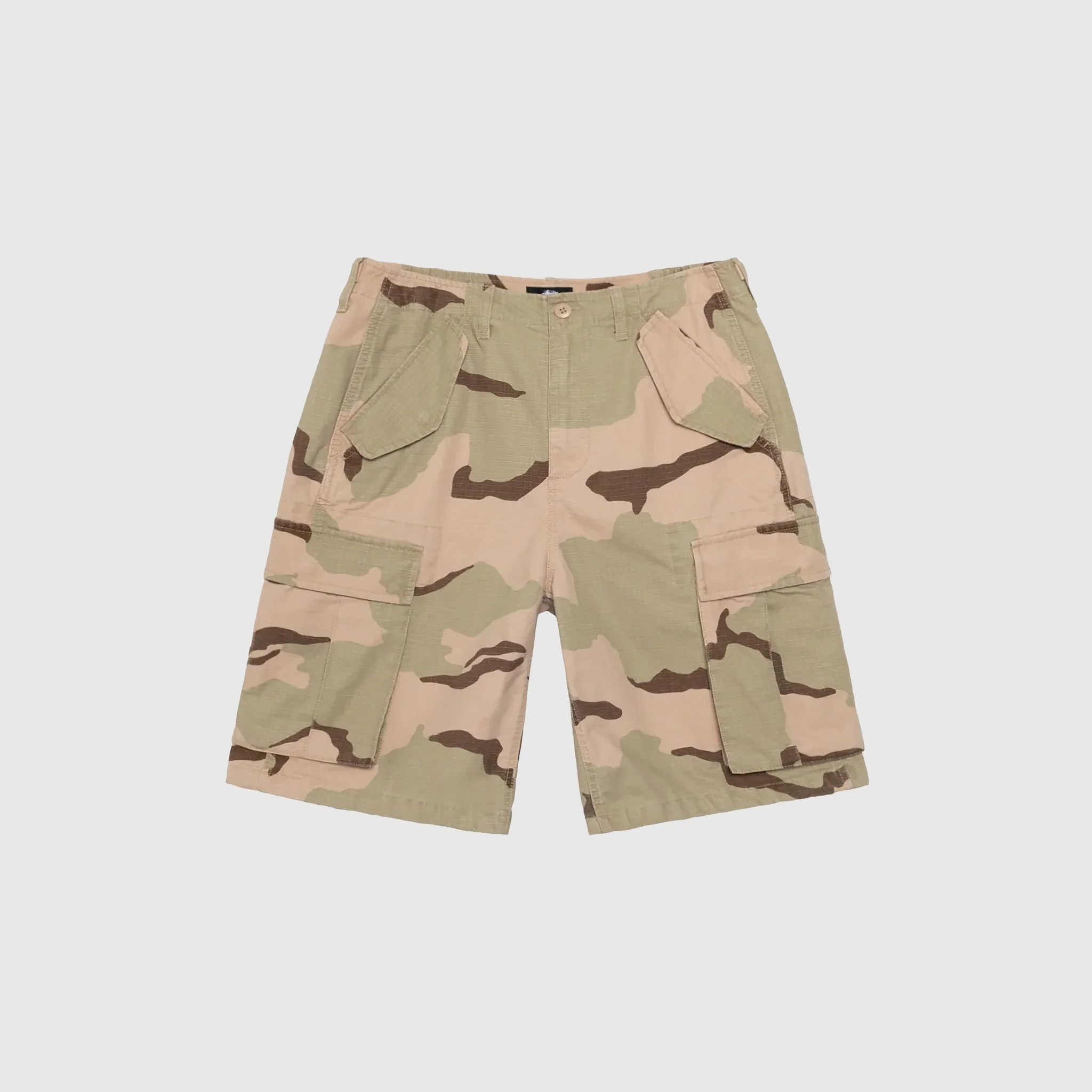 - 112338-SACA - Sand Camo - 100% Cotton - Stonewashed cotton ripstop - Zipper and button closure - Two front pockets with a flap and a snap closure - Two rear pockets with flap and snap button closure - Two cargo pockets with a flap and a snap button closure - Adjustable waist tabs - Woven label on the back - Baggy fit