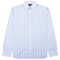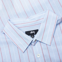 The Classic L/S Shirt Stripe in Light Blue from Stussy features a double button closure, chest pocket adorned with a STÜSSY tag, and cuffed buttoned sleeves. The back hanger loop detail adds a touch of convenience. Double button closure Chest pocket with STÜSSY tag Cuffed buttoned sleeves Style No: 1110317-LBLU - Double button closure - Chest pocket with STÜSSY tag - Cuffed buttoned sleeves - Back hangar loop detail - Style No: 1110317-LBLU