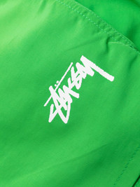 Stock Water swim shorts from Stussy featuring grass green, logo print at the leg, straight leg, elasticated waistband, two side inset pockets and rear welt pocket. Be mindful to try on swimwear over your own garments.. DETAILS Composition Synthetic Nylon100 % Model ID 113155-CLASSICGREEN
