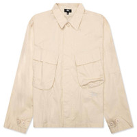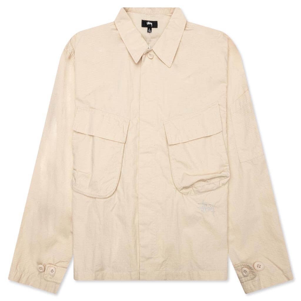 The latest addition to Stussy's workwear line is the Military L/S Over Shirt. This relaxed military-style overshirt is made from a blend of BCI cotton and recycled nylon. The design features a hidden button placket, three-dimensional flap pockets, and a single patch pocket at the sleeve. A Stussy basic stock logo is embroidered at the front to finish the look. - 74% BCI cotton/21% recycled nylon/5% nylon - Relaxed fit - Dropped shoulder - Flap pockets - Adjustable cuffs - Style No: 1110321-BONE