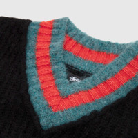 - 117142BLAC - Black - 33% Nylon, 32% Mohair, 32% Wool, 3% Spandex - V-neck collar - Exposed seams - Rib collar, cuffs, and hem - Stüssy stock flag label at side seam