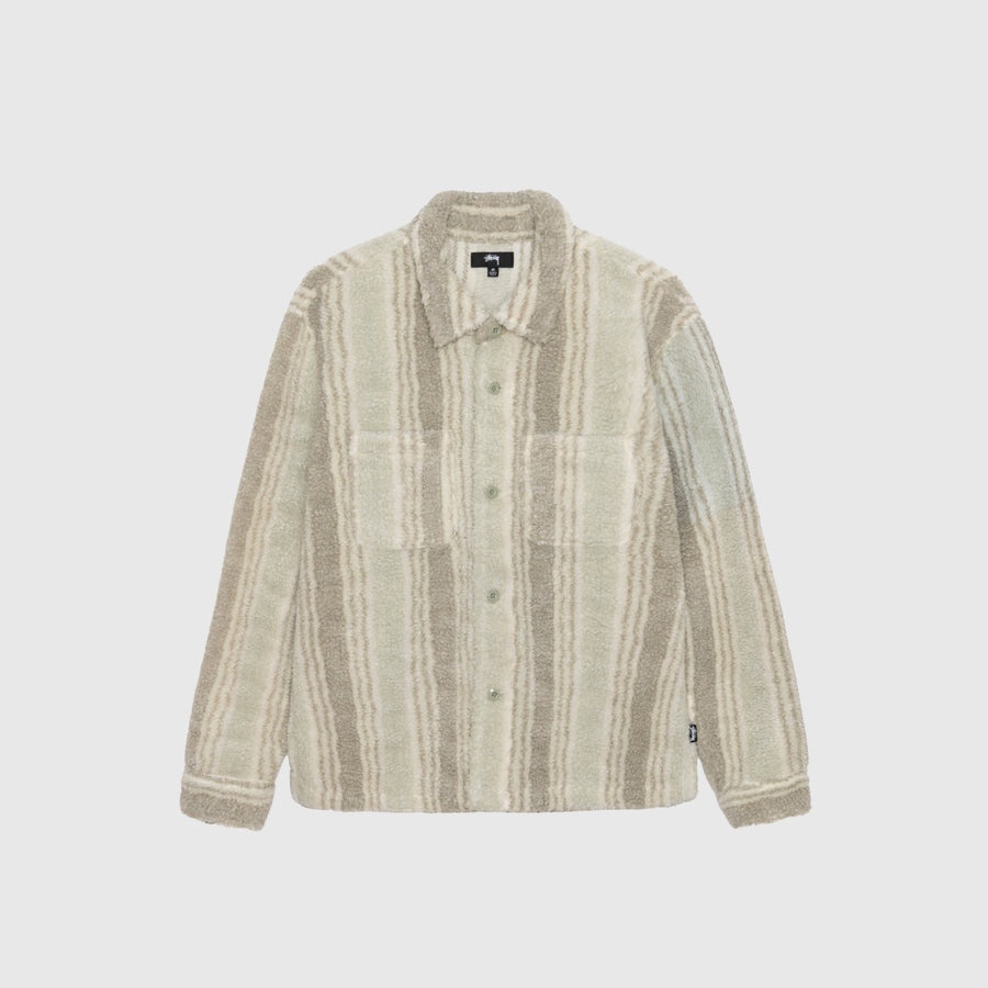- 1110197-NATL - Natural - 100% Poly Sherpa - Lining: 100% Polyester - Front button closure - Dual front chest pockets - Adjustable button cuffs - Stüssy big stock flag label at side seam - Flat hem