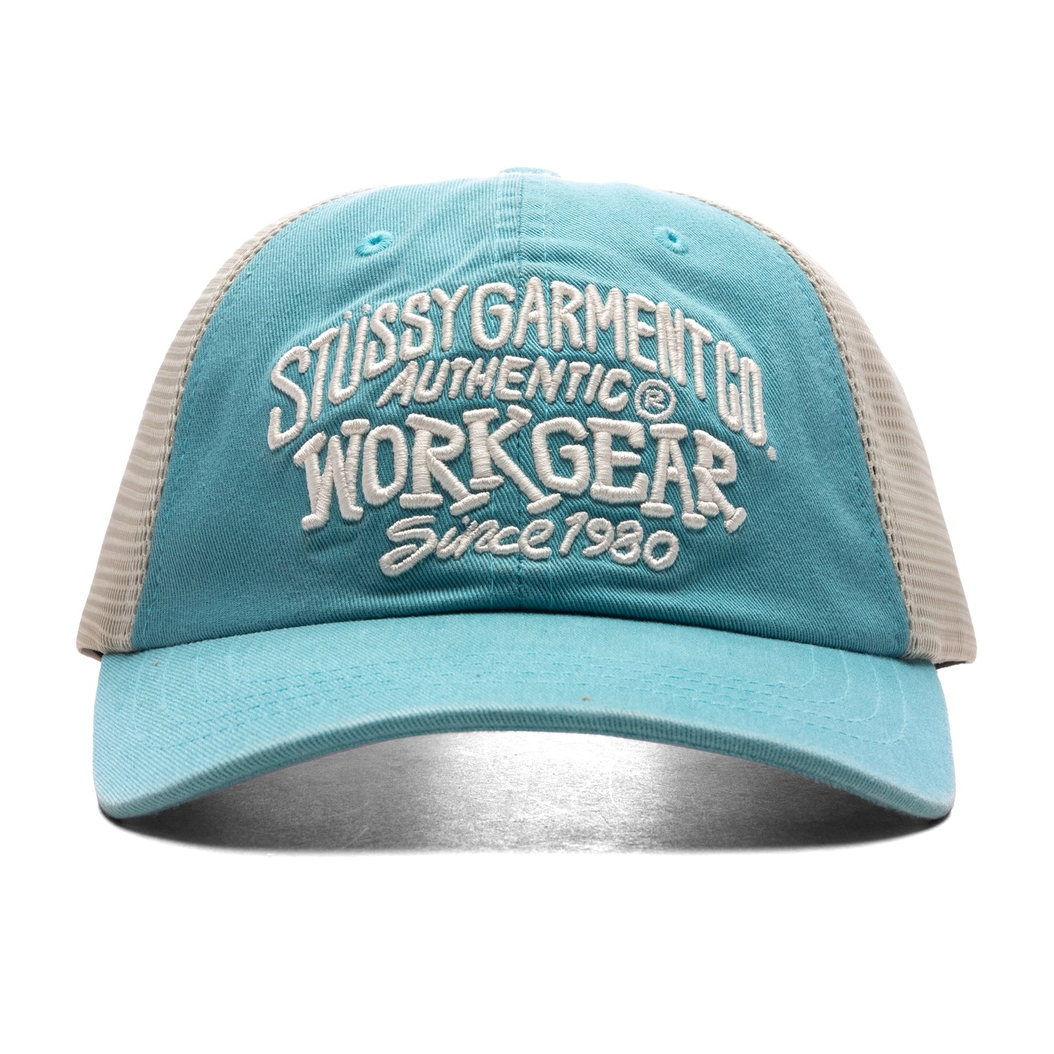 The Stussy LP Workgear Strapback Cap combines comfort and style, making it a staple accessory for any wardrobe. Crafted from washed cotton twill, this unstructured six-panel cap offers a relaxed fit suitable for everyday wear. The front features Stussy's authentic workgear logo in raised embroidery, adding a distinctive touch to the classic silhouette. - 100% Cotton - Mesh Panels: 100% Polyester - Low profile six-panel trucker - Unstructured crown - Pre-curved brim - Strapback closure with metal tri-glide - Cotton twill sweatband - Raised embroidery logo - Style No: 1311179-TEAL