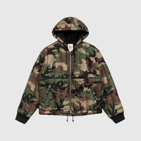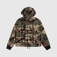 - 115858-WOCA - Woodland Camo - 100% Nylon - Fill: 100% Polyester - Quilted Nylon - Front zip closure - Pullover hood with adjustable drawstring - Two front welted pockets - Interior patch pocket - Embroidered Stussy logo on the front - Ribbed cuffs - Adjustable drawstring hem