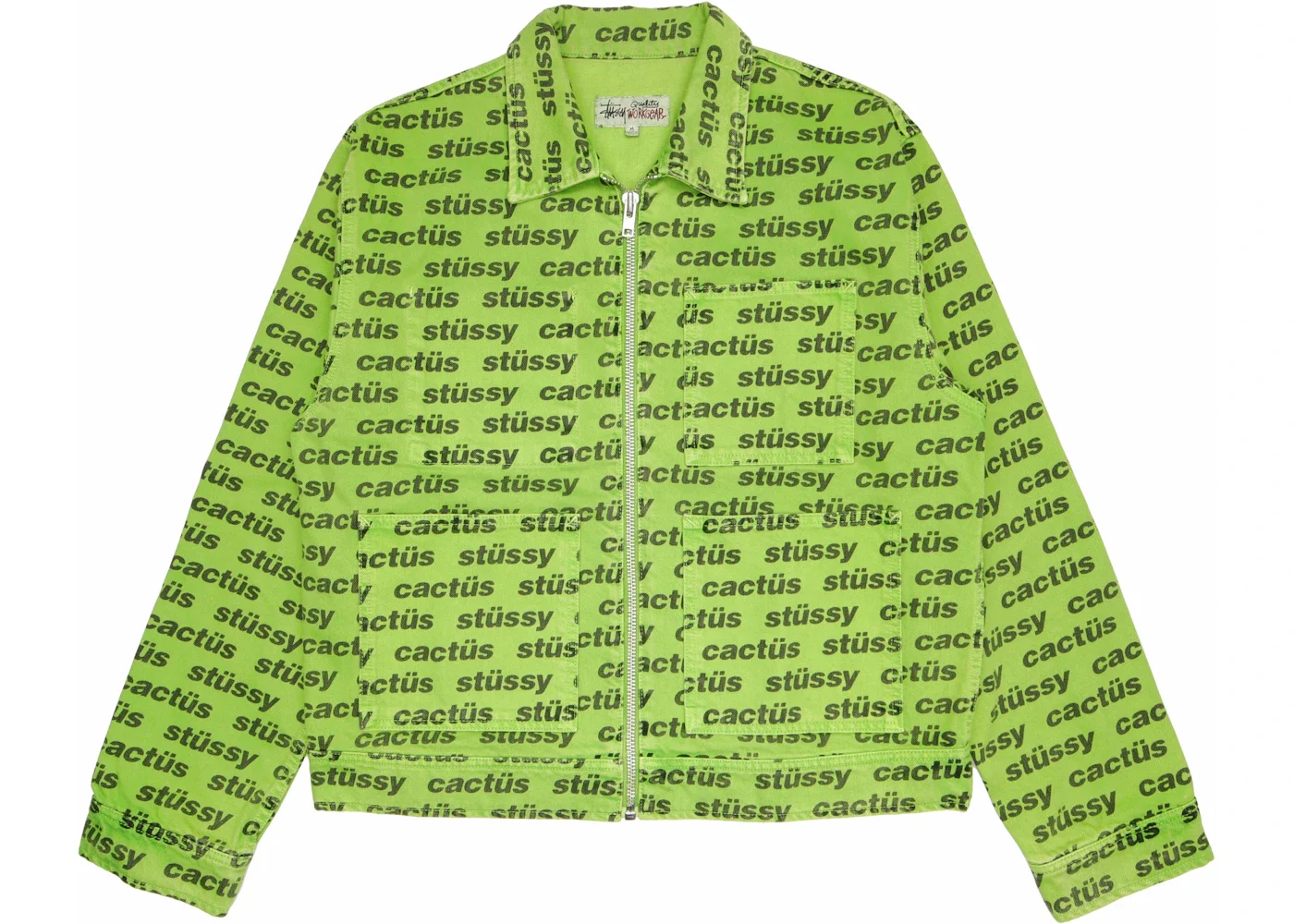 This green work jacket was released in June of 2021 as a part of Stussy and Cactus Plant Flea Market's first collaboration since 2019. This work jacket features an all over print Stussy x Cactus Plant Flea Market logo design and was released alongside a pair of orange Big O'l Jeans that feature the same pattern. Stussy and Cactus Plant Flea Market released eight new apparel items as a part of their June 2021 collaboration. The Stussy x Cactus Plant Flea Market Work Jacket in green was released at the retail price of $200. - Season SS21 - Color Green - Release Date 2021-06-25 - Retail Price 200 - Featured false