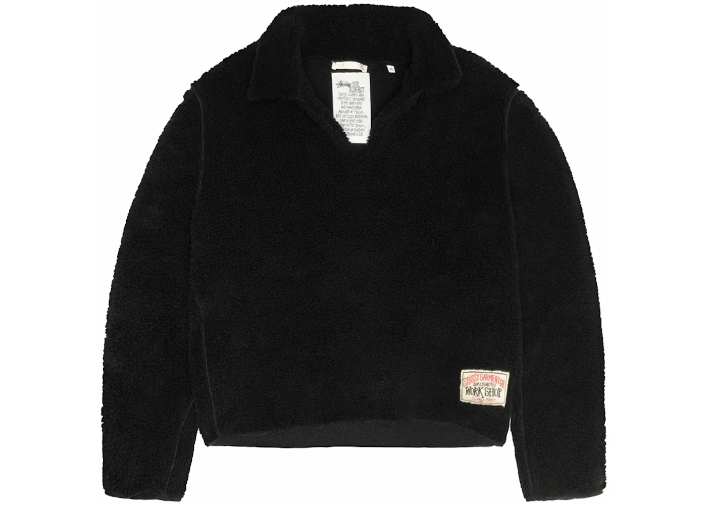 The Stussy x Our Legacy Curly Fleece Runner Sweat Black is a pullover crafted from black polyester and acrylic Italian fleece. An open v-neck and shirt collar balances the cropped, boxy fit. A "Work Shop x Stussy" patch appears on the left front, while additional branding appears on the label inside the collar. Our Legacy is a clothing brand based in Stockholm, Sweden, founded in 2005. It is known for applications of custom-developed and repurposed fabrics on signature shapes. American brand Stussy’s heritage originates in Laguna Beach, California, in the early 1980s, when they began producing surfboards and surfwear. The two brands have a multi-year history of collaboration, and the 2023 releases pay homage to both brands’ heritage. In our opinion, the best feature of the Curly Fleece Runner is its uncommon use of fleece, which differentiates this piece from more typical jackets and half-zips. The Stussy x Our Legacy Curly Fleece Runner Sweat Black was released on January 19, 2024, and retailed at $200. - Season SS24 - Color Black - Release Date 2024-01-19 - Featured false - Requester Kelsey K - Uploaded By LL