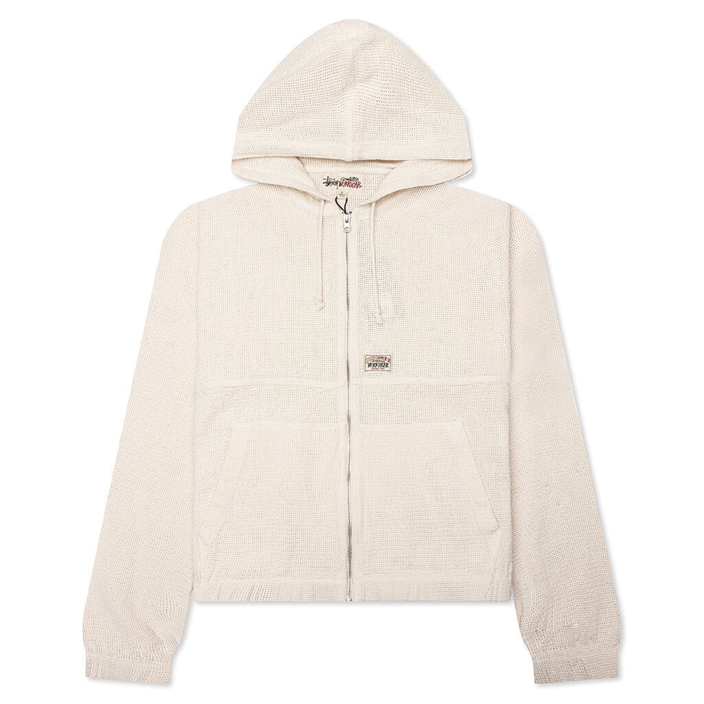 Stussy adds to its workwear selection with the Work Jacket Cotton Mesh in a Bone hue. This hooded work jacket is made from mesh cotton. It has a boxy fit and features a zip front closure and welt pockets. A Stussy authentic work gear label is woven at the front for a finishing touch. Stussy adds to its workwear selection with the Work Jacket Cotton Mesh in a Bone hue. This h ooded work jacket is made from mesh cotton. It has a boxy fit and features a zip front closure and welt pockets. A Stussy authentic work gear label is woven at the front for a finishing touch. Style No: 115769-BONE - 100% Cotton - Full zip closure - Drawstring hood - Welt pockets - Elastic cuffs + hem - Boxy fit - Style No: 115769-BONE