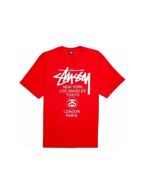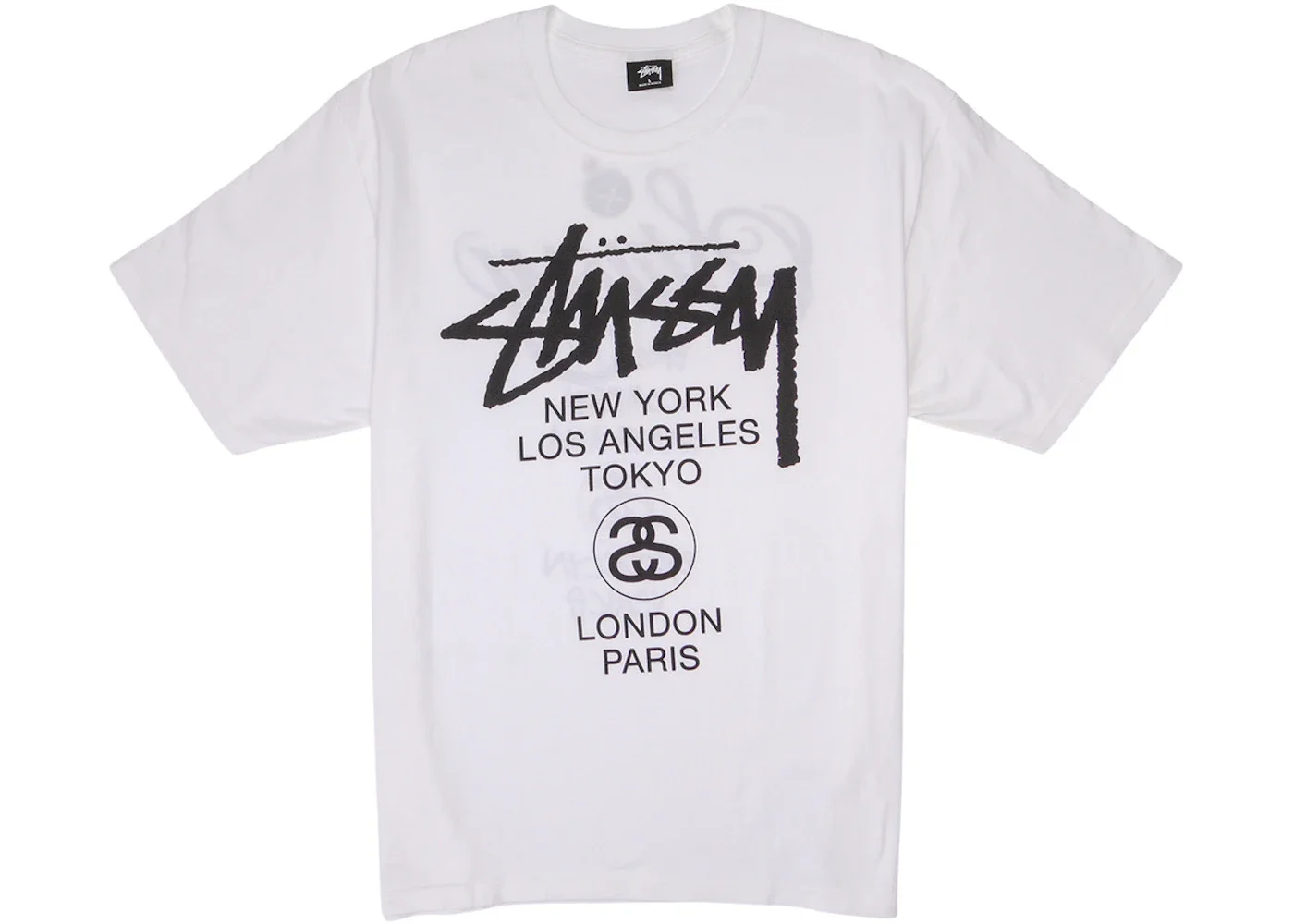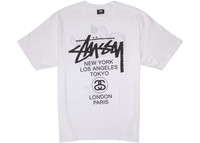 The Stussy World Tour T-shirt White commemorates some of the world’s capitals by imprinting New York, Tokyo, Paris, Los Angeles, and London in enlarged black font on its front. The cuffs and hem of this t-shirt have an inward folded border with double stitch lines. Additionally, this 100% cotton tee features a ribbed crewneck. Its front starts with a bold Stussy signature stretching across the yoke. A list of city names follows, covering much of the body. The back adopts a similar design, but instead of world style leaders, it displays the names of streetwear strongholds, such as Venice, Bronx, Brooklyn, Santa Ana, and Compton, below the brand logo. Our experts like the screen-printed city names on the back and front of the Stussy World Tour T-shirt White. Their spirited fonts freshen a classic crewneck tee and tell the story of the resilience of streetwear. The t-shirt’s release date was April 23rd, 2021 with a $40 retail price. - Season SS21 - Color White - Release Date 2021-04-23 - Retail Price 40 - Featured false
