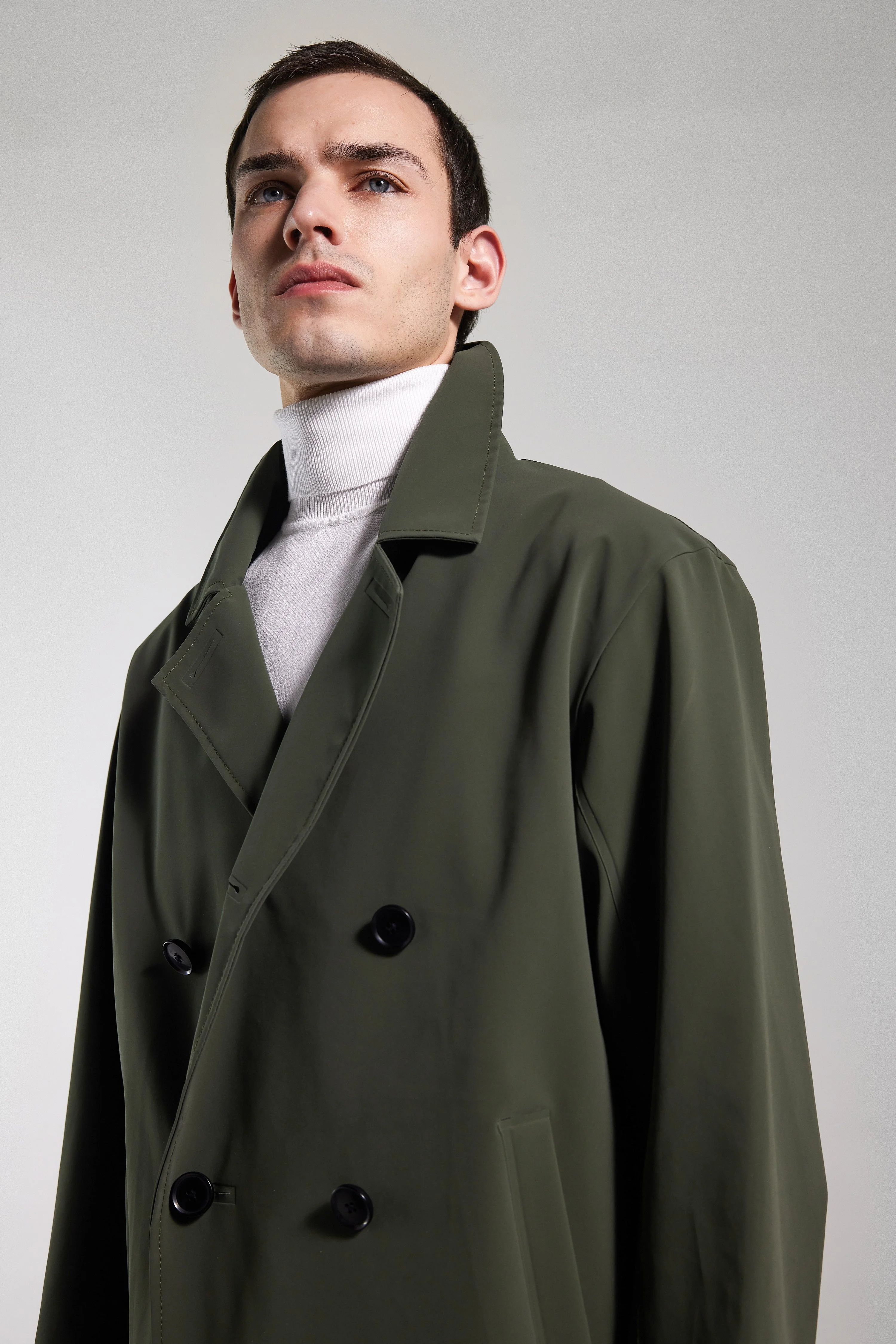 Atvidaberg is a classically cut double-breasted raincoat for men. Stay stylish and dry in this timeless piece crafted from light and airy waterproof fabric with a matte finish. Tailored with double-welded seams, it's completely resistant to moisture, making this regular-fit raincoat the perfect smart coat for unpredictable spring weather. The model is 183 cm / 6′ 0” Wearing → SIZE M GARMENT DETAILS • Lightweight 230-gram fabric • Completely waterproof • Matte-textured fabric finish • Double-breasted • Regular fit • Acrylic buttons • Open side pockets • Debossed logo at back collar • Double-welded seams • +20 000 mm water column pressure • Designed in Stockholm • Made in Europe MATERIAL Coating: 100% PVC rubberized coating Membrane: 100% polyester Read more about our fabrics