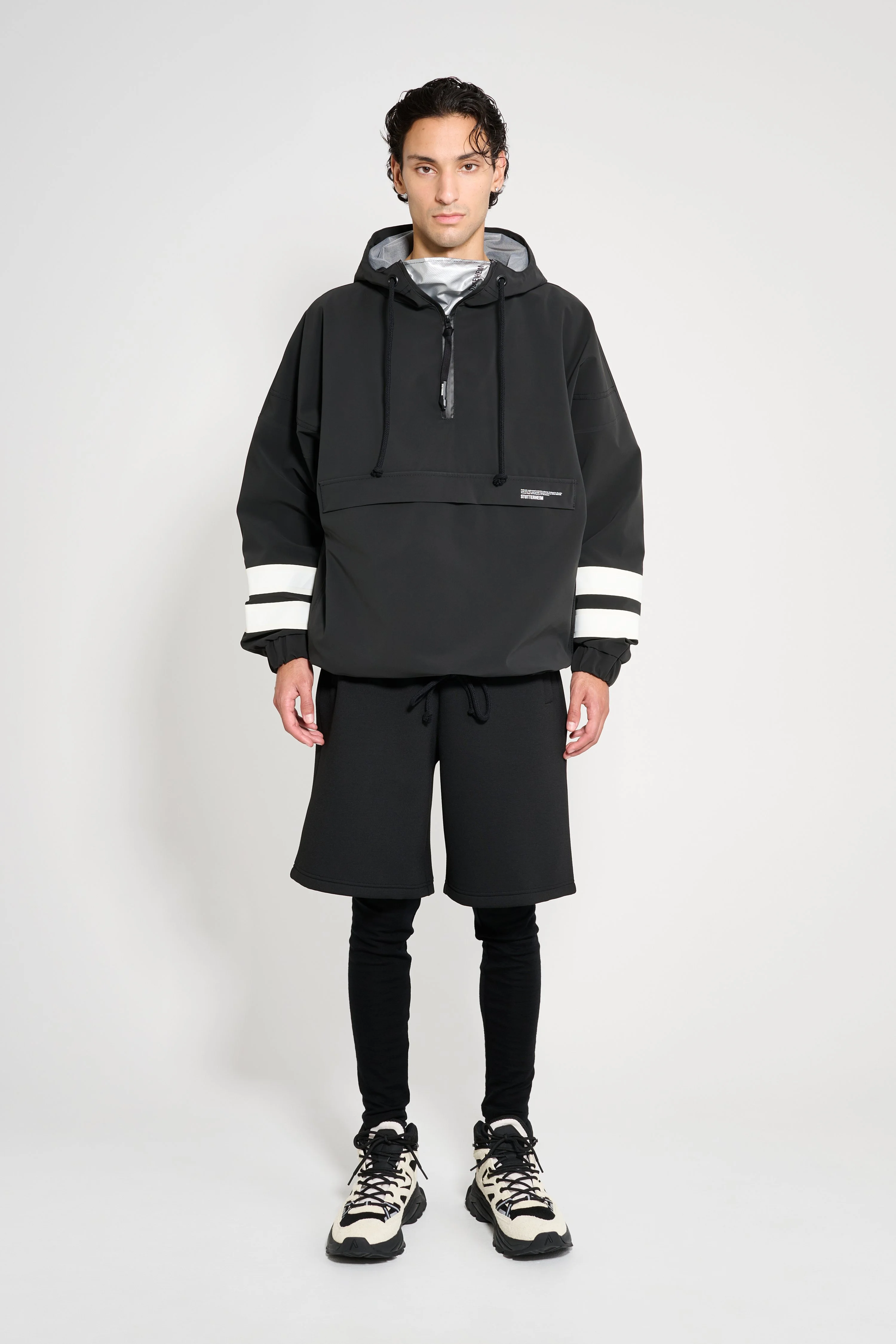 Forsa Stripe is a classic anorak for men in light and airy waterproof fabric with a matte finish. Constructed with double-welded seams to ensure complete protection against rain, this relaxed-fit jacket is designed for functionality. The short front zipper, drawstring hood and adjustable bottom hem add flexibility and comfort while the front pouch pocket provides a practical and stylish detail. The model is 183 cm / 6'0 Wearing → SIZE M GARMENT DETAILS • Lightweight 230-gram fabric • Matte-textured fabric finish • Completely waterproof • Relaxed fit • Pullover anorak • Short aqua guard front zip with silver insert • Front pouch pocket with printed logo artwork • Elastic sleeve cuffs • Side pockets with hidden zip closure • Drawstring hood with chunky cotton laces • Adjustable bottom hem with chunky drawstring cotton laces • Under-arm eyelets for ventilation • +20 000 mm water column pressure • Designed in Stockholm • Made in Europe MATERIAL Coating: 100% PVC rubberized coating Membrane: 100% polyester Read more about our fabrics