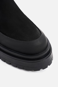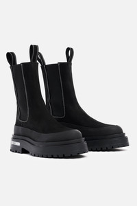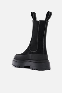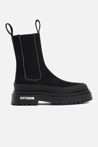 The Highwalker boots are chunky mid-calf boots perfect for the cold seasons. A true statement boot, it elevates any outfit and pairs excellently with a raincoat from STUTTERHEIM. Crafted in the finest quality leather, these comfortable boots will stand the test of time while the waterproof lug sole and rubber rim ensure protection from leakage and wet feet. Double pull tabs and elastic on the sides of the shaft make these stompers easy to pull on and off. GARMENT DETAILS • Waterproof chunky rubber lug sole • Waterproof rubber rim above sole • Mid-calf length • High-quality elastic on both sides of shaft • Double pull tabs at top of shaft • Contrast colour stitching • Raised STUTTERHEIM logo on rubber sole exterior • Small nylon logo label on shaft side • Designed in Stockholm • Made in Europe MATERIAL Upper: Vegetable-tanned Italian Nubuck leather Outsole: Rubber Details: Polyester Read more about our fabrics