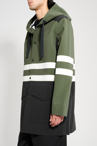 Nockeby is a straight-fit raincoat for men in sturdy, matte-textured waterproof fabrics. Expertly made, it’s tailored with triple-welded seams for complete protection against the rain. The drawstring hood and under-arm eyelets add ease of movement and comfort, while the two-tone design and colour-block stripes make this a true statement style, defying bad weather in the name of fashion. The model is 183 cm / 6'0 Wearing → SIZE M GARMENT DETAILS - Heavyweight 530-gram fabric - Matte-textured finish - Completely waterproof - Regular fit - Snap metal button front closure - Drawstring hood - Webbed laces - Patch pockets with flaps - Triple-welded seams - Under-arm eyelets for ventilation - +20 000 mm water column pressure - Designed in Stockholm - Made in Europe MATERIAL Coating: 100% PVC rubberized coating Membrane: 52% Cotton, 48% polyester Read more about our fabrics