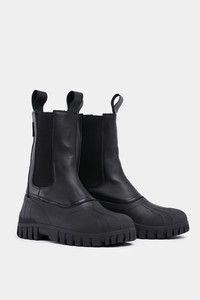 Patrol Shaft Boots are comfortable boots for men and women, perfect for snowy and cold weather. Constructed with a leather upper which has been treated to be water-repellent and a galosh-style duck sole, rest assured that feet will be kept dry as well as warm. The rubber lug sole ensures a firm grip on slippery ground and the padded ankle-length shaft adds warmth and comfort on days when it's most needed. Elastic inserts and pull tabs make the boots easy and quick to transition in and out of. GARMENT DETAILS - Waterproof rubber lug sole - Water-repellent treated leather upper - Galosh-style duck sole - Rounded shell toe - Ankle-length - High shaft with elastic inserts - Pull tabs on shaft - Small logo patch on shaft - Padded ankle - Pull-tab at back - Unisex style - Designed in Stockholm - Made in Europe MATERIAL Upper: Vegetable-tanned Italian leather Outsole: Rubber Details: Polyester Read more about our fabrics
