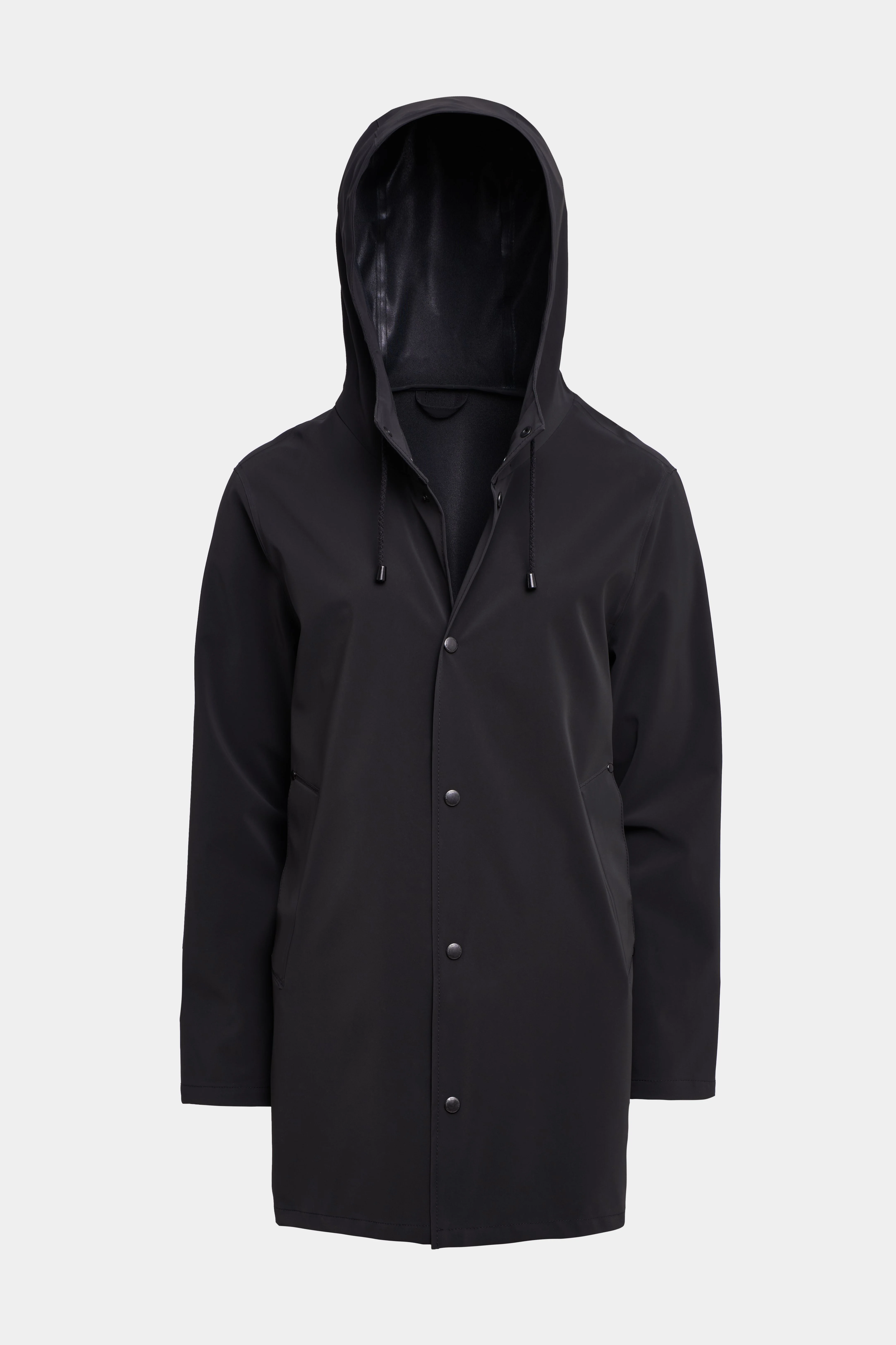 Stockholm Lightweight Matte is a straight-fit raincoat in ultra-light waterproof fabric with a matte textured finish. Expertly made, it’s tailored with double-welded seams for complete protection against the rain. The drawstring hood and under-arm eyelets add ease of movement and comfort in uncomfortable weather. The thin and packable fabric makes this garment perfect when on the go. The model is 188 cm / 6' 2" Wearing → SIZE M GARMENT DETAILS - Lightweight 230-gram fabric - Matte textured finish - Packable - Completely waterproof - Straight unisex fit - Snap metal button closures - Drawstring hood - Open welt pockets - Double welded seams - Under-arm eyelets for ventilation - +20 000 mm water column pressure - Designed in Stockholm - Made in Europe MATERIAL Coating: 100% PVC rubberized coating Membrane: 100% polyester Read more about our fabrics