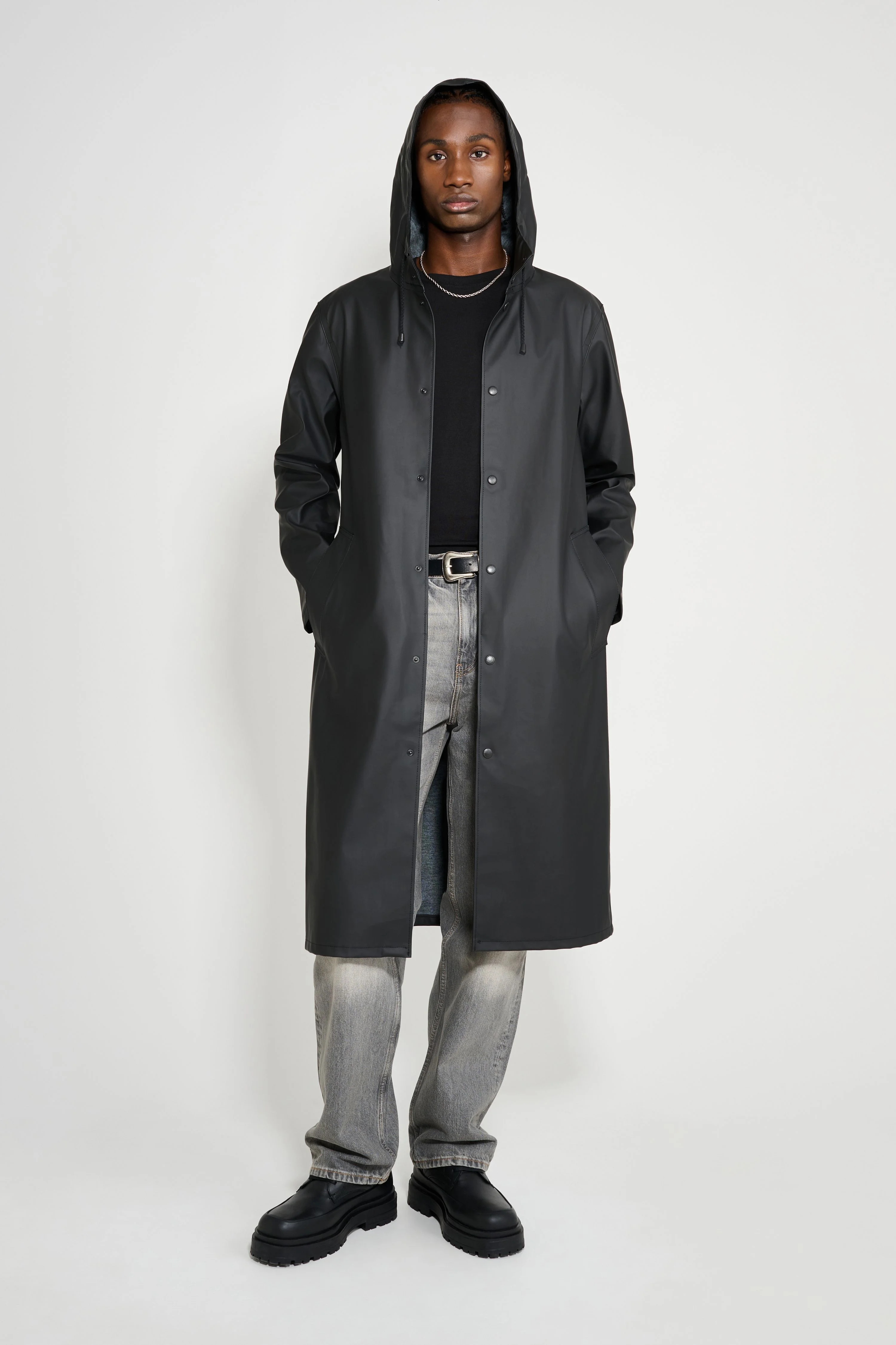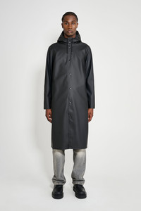 Stockholm Long is a straight-fit knee-length raincoat in sturdy and hard-wearing waterproof fabric. Expertly made, it’s tailored with double-welded seams for complete protection against the rain. The drawstring hood and under-arm eyelets add ease of movement and comfort in uncomfortable weather. GARMENT DETAILS - Mid-weight 380-gram fabric - Completely waterproof - Straight unisex fit - Knee-length - Snap metal button closures - Drawstring hood - Open welt pockets - Double welded seams - Under-arm eyelets for ventilation - +20 000 mm water column pressure - Designed in Stockholm - Made in Europe MATERIAL Coating: 100% PVC rubberized coating Membrane: 52% cotton, 48% polyester Read more about our fabrics