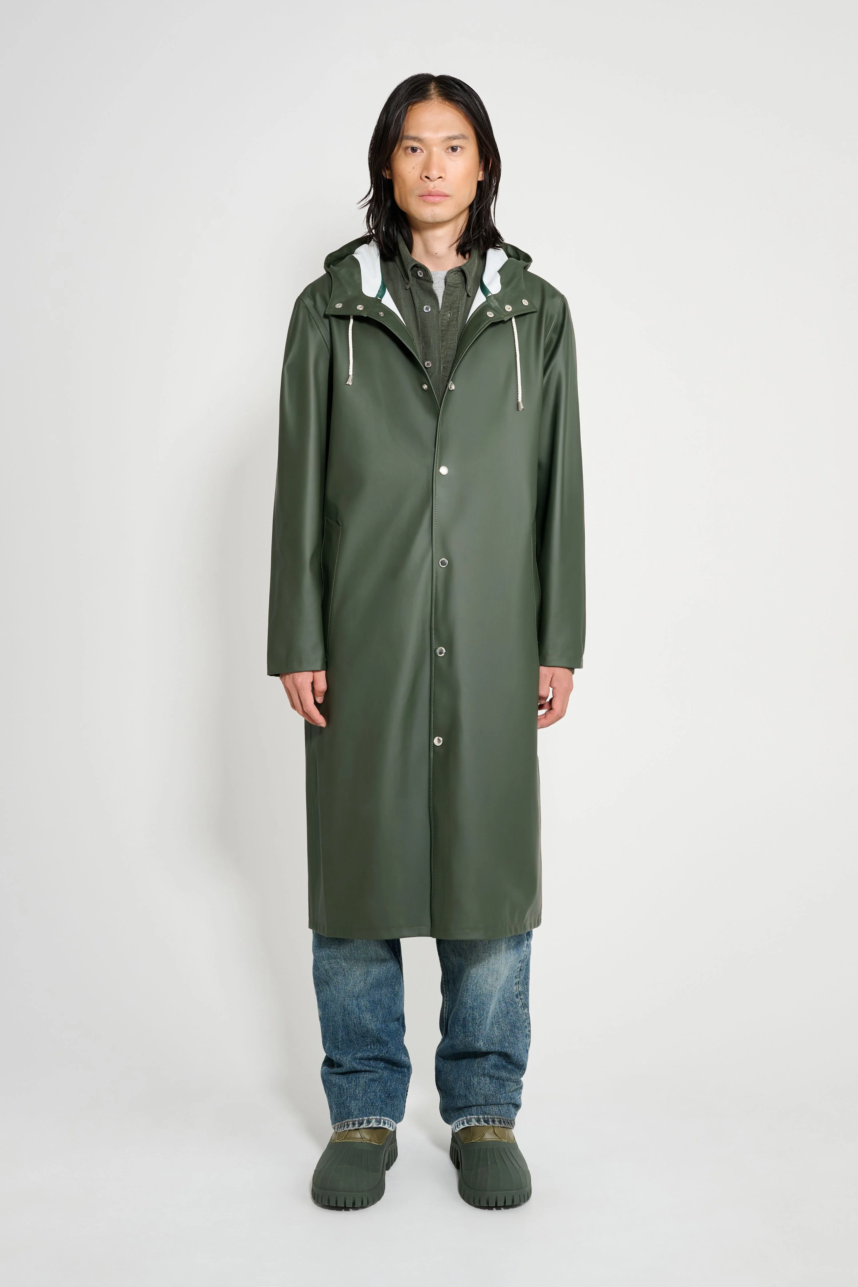 Stockholm Long is a straight-fit knee-length raincoat in sturdy and hard-wearing waterproof fabric. Expertly made, it’s tailored with double-welded seams for complete protection against the rain. The drawstring hood and under-arm eyelets add ease of movement and comfort in uncomfortable weather. GARMENT DETAILS - Mid-weight 380-gram fabric - Completely waterproof - Straight unisex fit - Knee-length - Snap metal button closures - Drawstring hood - Open welt pockets - Double welded seams - Under-arm eyelets for ventilation - +20 000 mm water column pressure - Designed in Stockholm - Made in Europe MATERIAL Coating: 100% PVC rubberized coating Membrane: 52% cotton, 48% polyester Read more about our fabrics