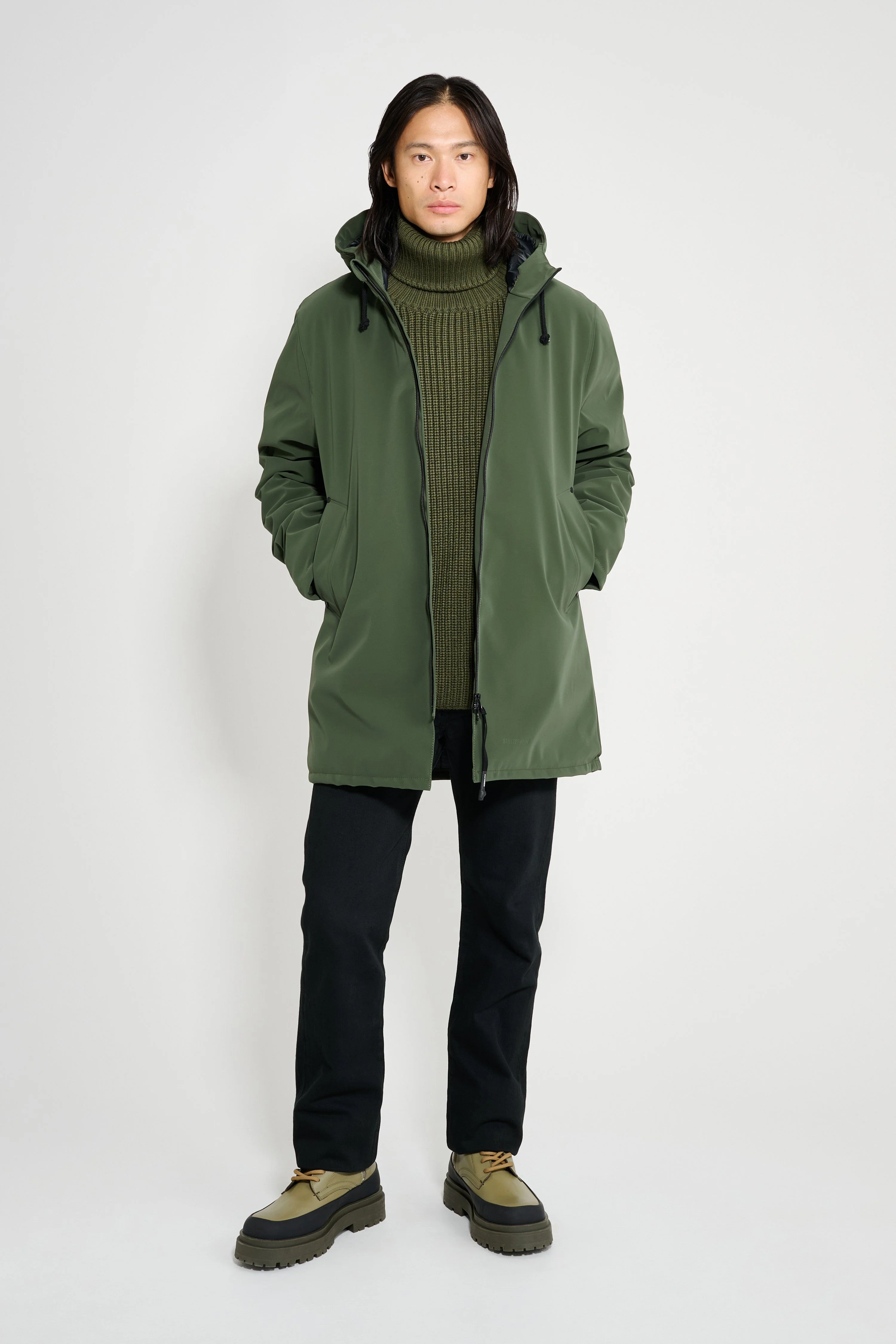 Stockholm Winter Matte is a straight-fit warm raincoat in sturdy and hard-wearing waterproof fabric with a matte-textured finish. It’s insulated with padding for warmth during the winter season. Expertly made, it’s tailored with double-welded seams for complete protection against rain and snow. The drawstring hood and knitted wristlets add ease of movement and comfort in uncomfortable weather. The model is 184 cm / 6′ 1″ Wearing → SIZE M GARMENT DETAILS - Midweight 280-gram shell fabric - Matte-textured finish - Completely waterproof - 150-gram technical insulator filling - Polyester lining - Straight unisex fit - Aqua guard zipper - Nylon logo pull tab - Drawstring hood - Knitted wristlets - Fleece-lined welt side pockets - Fleece-lined inside welt pocket - Double welded seams - +20 000 mm water column pressure - Designed in Stockholm - Made in Europe MATERIAL Coating: 100% PVC rubberized coating Membrane: 100% polyester Lining: 100% polyester with poly filling Read more about our fabrics