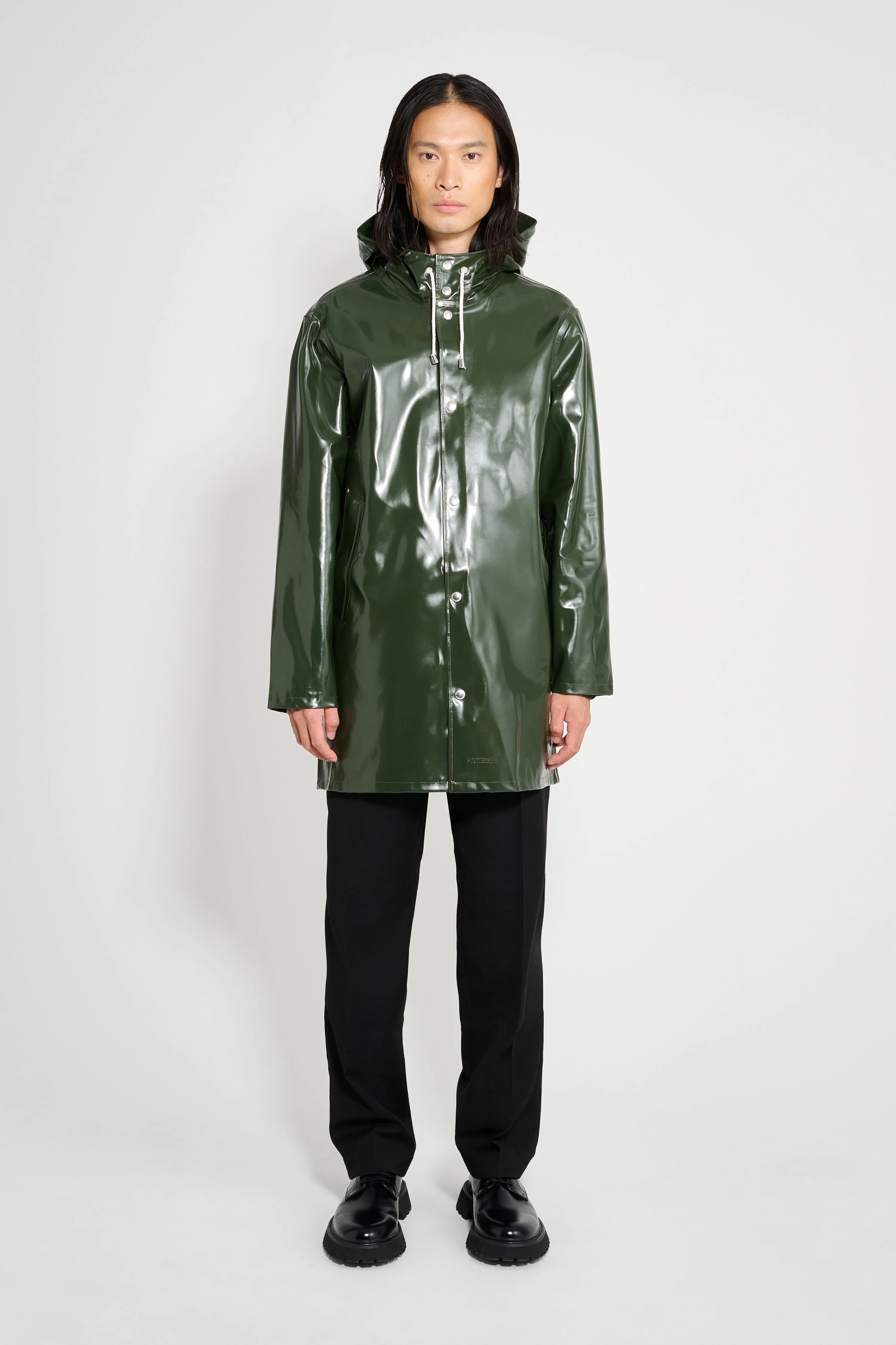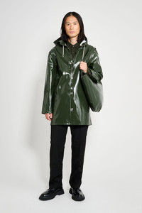 Stockholm Opal is a straight-fit raincoat in shiny yet sturdy waterproof fabric. Expertly made, it’s tailored with double-welded seams for complete protection against the rain. The drawstring hood and under-arm eyelets add ease of movement and comfort in uncomfortable weather. The model is 187 cm / 6′ 2″ Wearing → SIZE M GARMENT DETAILS - Heavy-weight 530-gram fabric - Shiny high-gloss fabric finish - Completely waterproof - Straight unisex fit - Snap metal button closures - Drawstring hood - Open welt pockets - Double welded seams - Under-arm eyelets for ventilation - +20 000 mm water column pressure - Designed in Stockholm - Made in Europe MATERIAL Coating: 100% PVC rubberized coating Membrane: 52% cotton, 48% polyester Read more about our fabrics