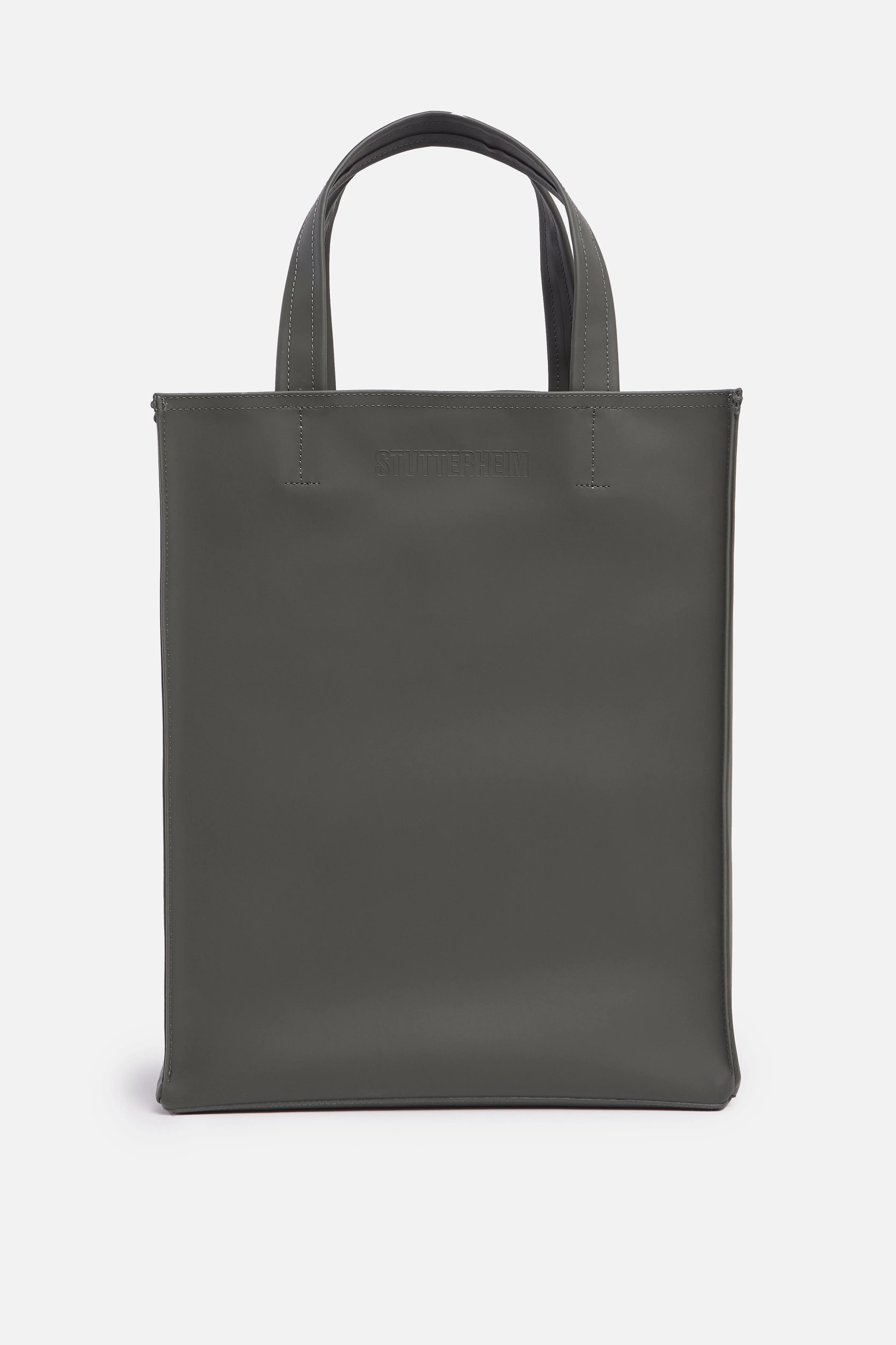 Stockstund is a classic tote bag crafted in dense and sturdy waterproof fabric, perfectly sized to fit a laptop as well as essential items such as a phone, wallet etc. This elegant, rectangular piece can be carried by hand or worn over the shoulder with generously-sized top handles. A magnetic snap button at the top opening keeps belongings safe while the Cordura membrane ensures durability. GARMENT DETAILS - Heavyweight 1200-gram fabric - Completely waterproof - Durable Cordura membrane - Magnetic metal snap button fastening - Top handles - Debossed logo at centre-top - Printed logo label inside - Fits laptop up to 14" size - +20 000 mm water column pressure - Height: 38 cm / 15″ - Width: 31 cm / 12.2″ - Depth: 12.5 cm / 4.9″ - Designed in Stockholm - Made in Europe MATERIAL Coating: 100% PVC rubberized coating Membrane: 100% polyester Read more about our fabrics