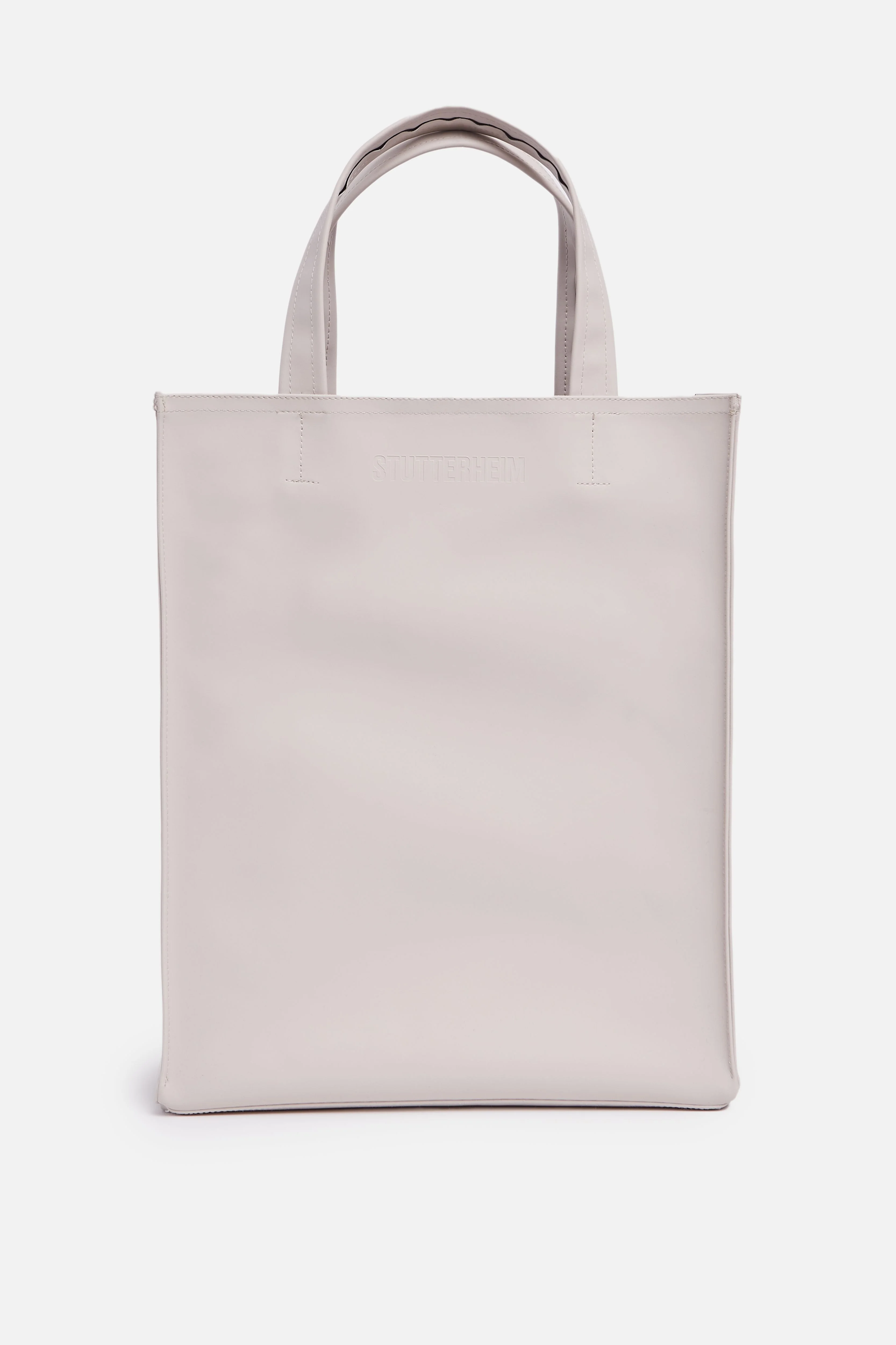 Stockstund is a classic tote bag crafted in dense and sturdy waterproof fabric, perfectly sized to fit a laptop as well as essential items such as a phone, wallet etc. This elegant, rectangular piece can be carried by hand or worn over the shoulder with generously-sized top handles. A magnetic snap button at the top opening keeps belongings safe while the Cordura membrane ensures durability. GARMENT DETAILS - Heavyweight 1200-gram fabric - Completely waterproof - Durable Cordura membrane - Magnetic metal snap button fastening - Top handles - Debossed logo at centre-top - Printed logo label inside - Fits laptop up to 14" size - +20 000 mm water column pressure - Height: 38 cm / 15″ - Width: 31 cm / 12.2″ - Depth: 12.5 cm / 4.9″ - Designed in Stockholm - Made in Europe MATERIAL Coating: 100% PVC rubberized coating Membrane: 100% polyester Read more about our fabrics