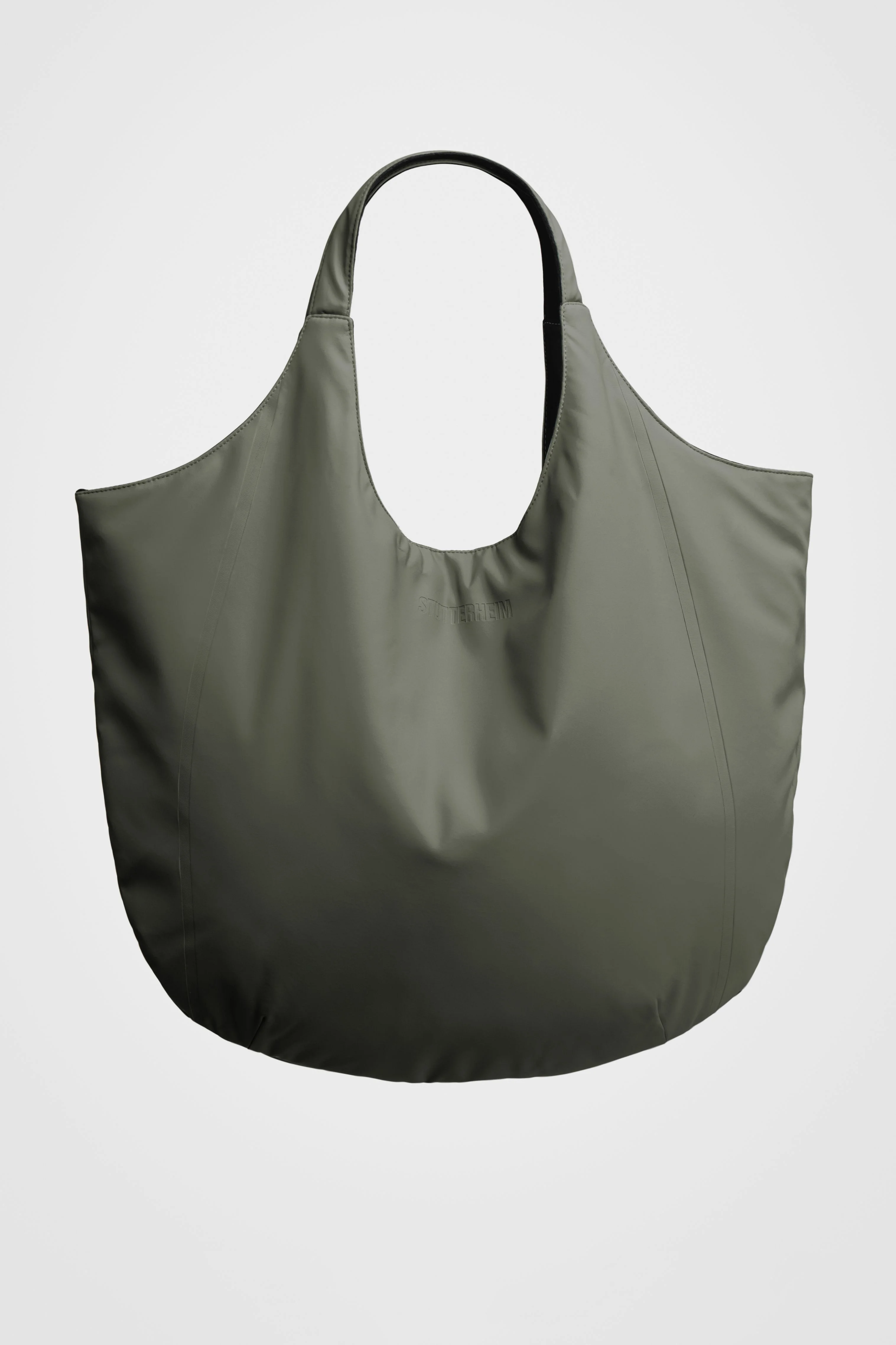 Svea Puffer Bag is a generously sized padded carry-all, suitable for everything from your weekly food shop to laundry runs, as a gym bag or even to pack for a weekend trip. Made in sturdy, hard-wearing waterproof fabric and constructed with double-welded seams, no moisture can get through to your belongings and the padding adds a layer of cushioned protection. The fleece-lined handles fit comfortably over the shoulder or in the hand while the inside zipped pocket secures small items or valuables. GARMENT DETAILS • Heavyweight 530-gram fabric • 150-gram technical insulator filling • Black cotton lining • Fleece-lined comfort grip handle • Double welded seams • Inside zip pocket • Inside phone pocket • Snap metal button closure • Debossed logo on front • Handles fit over shoulder or in hand • Height: 49 cm / 19" • Width: 62 cm / 24" • Designed in Stockholm • Made in Europe MATERIAL 100% PVC rubberized coating Membrane: 52% cotton, 48% polyester Lining: 70% cotton, 30% polyester