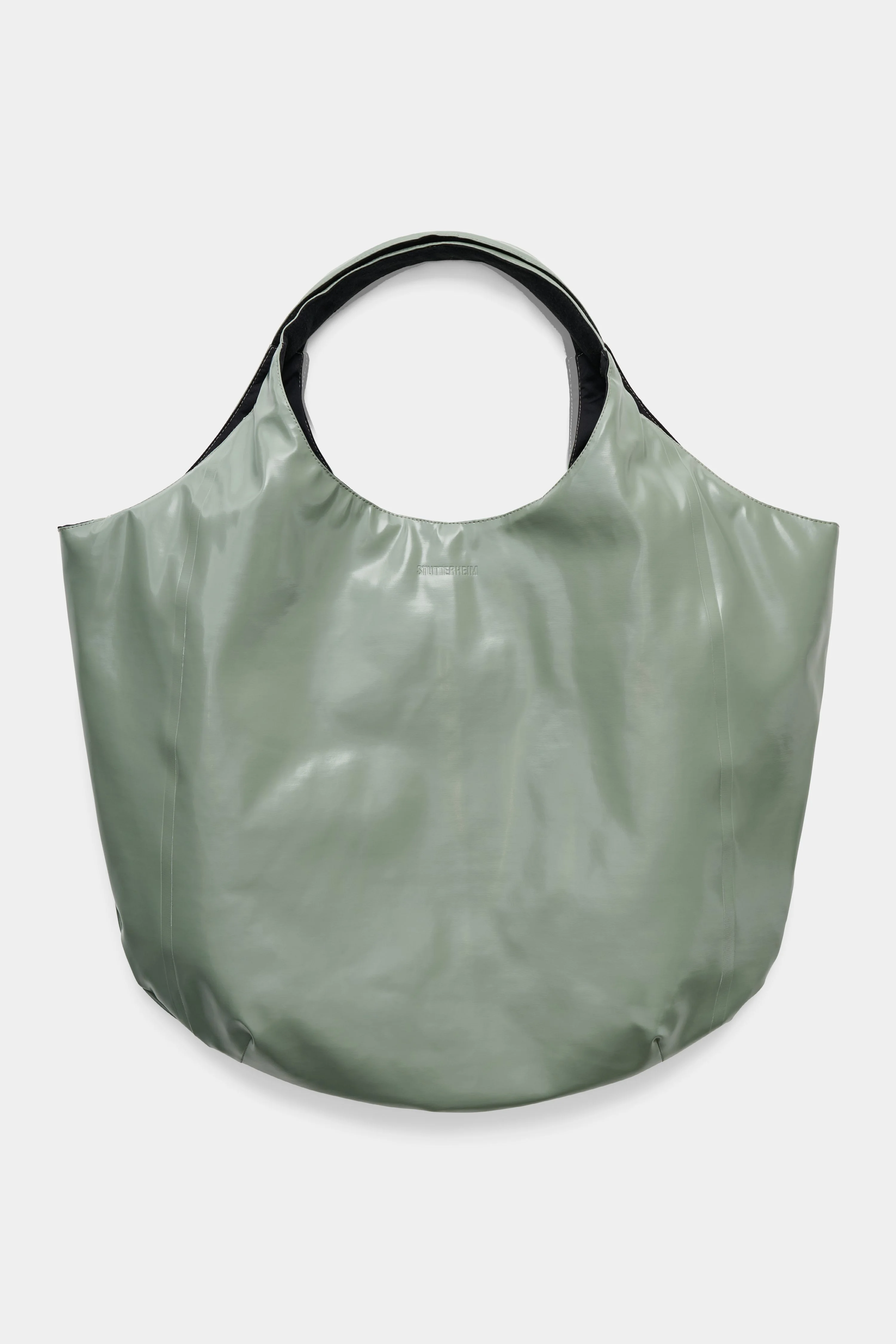 Svea Puffer Bag Opal is a generously sized padded carry-all, suitable for everything from the weekly food shop to laundry runs, as a gym bag or even to pack for a weekend trip. Made in shiny yet sturdy waterproof fabric and constructed with double-welded seams, no moisture can get through to your belongings and the padding adds a layer of cushioned protection. The fleece-lined handles fit comfortably over the shoulder or in the hand while the inside zipped pocket secures small items or valuables. GARMENT DETAILS - Heavyweight 530-gram fabric - Shiny high-gloss fabric finish - 150-gram technical insulator filling - Black cotton lining - Fleece-lined comfort grip handle - Double welded seams - Inside zip pocket - Inside phone pocket - Snap metal button closure - Debossed logo on front - Handles fit over shoulder or in hand - Height: 49 cm / 19" - Width: 62 cm / 24" - Designed in Stockholm - Made in Europe MATERIAL 100% PVC rubberized coating Membrane: 52% cotton, 48% polyester Lining: 70% cotton, 30% polyester Padding: 100% polyester with poly filling Read more about our fabrics