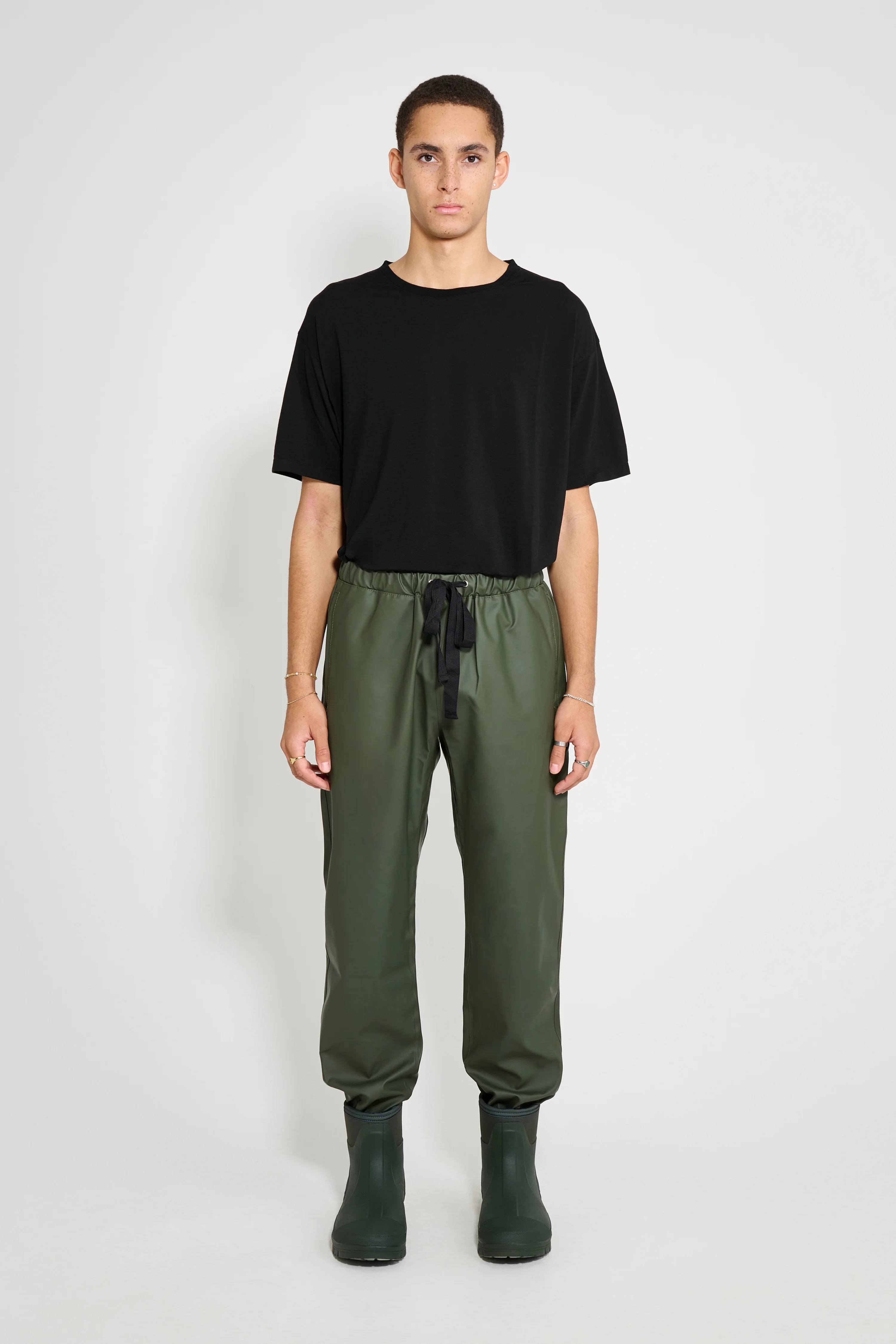 Vanadis are coverall trousers for men in light and airy waterproof fabric. Constructed with double-welded seams for complete rain protection, these trousers are perfect for cycling or other outdoor activities when the weather is wet. The elastic drawstring waist and bottom hems complete the relaxed fit and make the garment quick and easy to transition in and out of while providing ease of movement. Reflective stripes and eyelet punctures on each leg add visibility and breathability. The model is 187 cm / 6' 2" Wearing → SIZE M GARMENT DETAILS - Lightweight 230-gram fabric - Double-welded seams - Drawstring elastic waist - Elastic bottom hems - Reflective stripe on back of each leg for visibility - Eyelet puncture on each leg for ventilation - Side welt pockets - Single back welt pocket - +20 000 mm water column pressure - Designed in Stockholm - Made in Europe MATERIAL Coating: 100% PVC rubberized coating Membrane: 100% polyester Read more about our fabrics