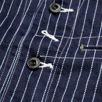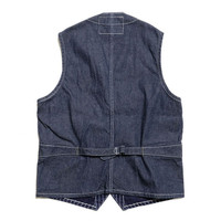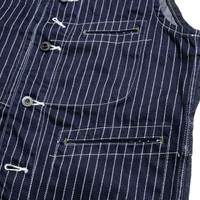 - This work vest is made of Wabash-stripe fabric. The fabric is indigo denim with pinstripe discharged printing. 9oz Wabash-stripe fabric for the front body and 11oz denim for the back is used. It is made based on work vests around the 1920s with specifications such as a chain fastening hole for the pocket watch under the top button and gilet style. - Main Fabric: 9oz Wabash Stripe / 11oz Denim (100% Cotton) - Button: Black Painted - Patch: Cotton Label - Others: Cinch Belt / Inner Pocket - Made in Japan - Model Wearing Size: 40(L) (Height 180cm / Weight 72kg)