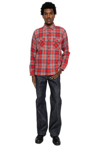 - Color: Red (165) - Inspired by two vintage FIVE BROTHER work shirts - Instead of a standard twill, it is woven in a rare herringbone twill, with four warp colors and four weft colors - During the 1940s~50s, manufacturers sought to differentiate themselves, and details such as multi-colored marbled buttons and gradient labels were distinctive of the era. - Made in Japan - Model is 6'2 wearing a size L