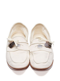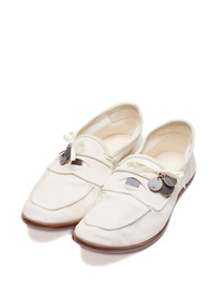 coin-embellished loafers Highlights - Off-white - Penny loafer design - Metal coin embellishments - Leather sole Imported Composition Sole: Rubber 100%, Leather 100% Lining: Suede 100% Outer: Suede 100%