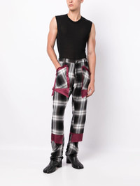 check-print asymmetric trousers Highlights - Black - Brown - Bordeaux red - Check print - Patchwork design - Asymmetric design - Drawstring fastening - Cut-out detailing - Belt loops - Frayed detailing Imported Composition Body: Rayon 95%, Silk 5% Lining: Cupro 100% SIZE & FIT Model measurements Height 6 ft 2 in(1.87 m) Bust/Chest 33.46 in(85 cm) Hips 35.03 in(89 cm) Waist 26.57 in(67.5 cm) FittingInformation Designed for a tapered leg, offering a loose unrestricted fit over the leg with a closer fit towards the ankle Adjust this piece’s waistband to your preference using the drawstring Made from a midweight non-stretch fabric This piece fits true to size – take your usual size