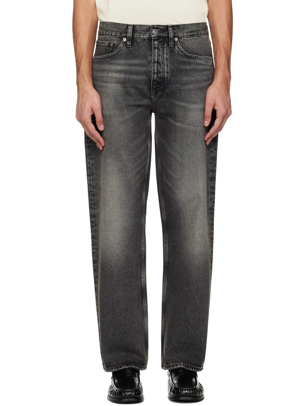 13.5 oz non-stretch organic cotton denim jeans. · Overdyed · Fading, whiskering, and subtle distressing throughout · Belt loops · Five-pocket styling · Button fly · Logo patch at back waistband Supplier color: New black worn 100% organic cotton. Made in Tunisia 261468M186015