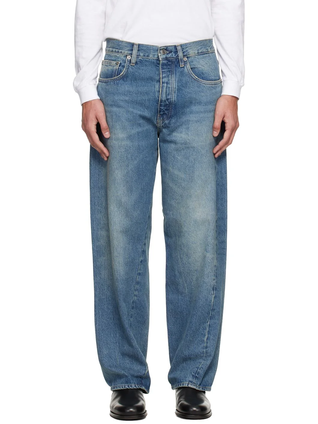 14 oz non-stretch organic cotton denim jeans. · Wide-leg · Mid-rise · Belt loops · Five-pocket styling · Button fly · Twisted outseams · Leather logo patch at back waist · Logo-engraved silver-tone hardware · Contrast stitching in tan Supplier color: Dark Blue Vintage 100% organic cotton. Made in Tunisia 261468M186006