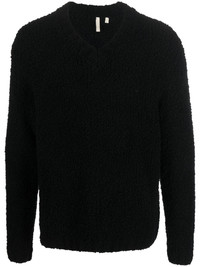 merino wool-blend V-neck jumper Highlights - Black - Merino wool blend - Knitted construction - Fleece texture - Ribbed v-neck - Drop shoulder - Long sleeves - Ribbed cuffs and hem Imported Composition Virgin Wool 90%, Polyester 10% SIZE & FIT Model measurements Height 6 ft 2 in(1.87 m) Bust/Chest 38.18 in(97 cm) Hips 36.61 in(93 cm) Waist 29.13 in(74 cm) FittingInformation Designed for a relaxed fit, this piece allows for comfort and movement when worn Made with a midweight knit, this piece offers some stretch This piece fits true to size – take your usual size Washing instructions Hand Wash