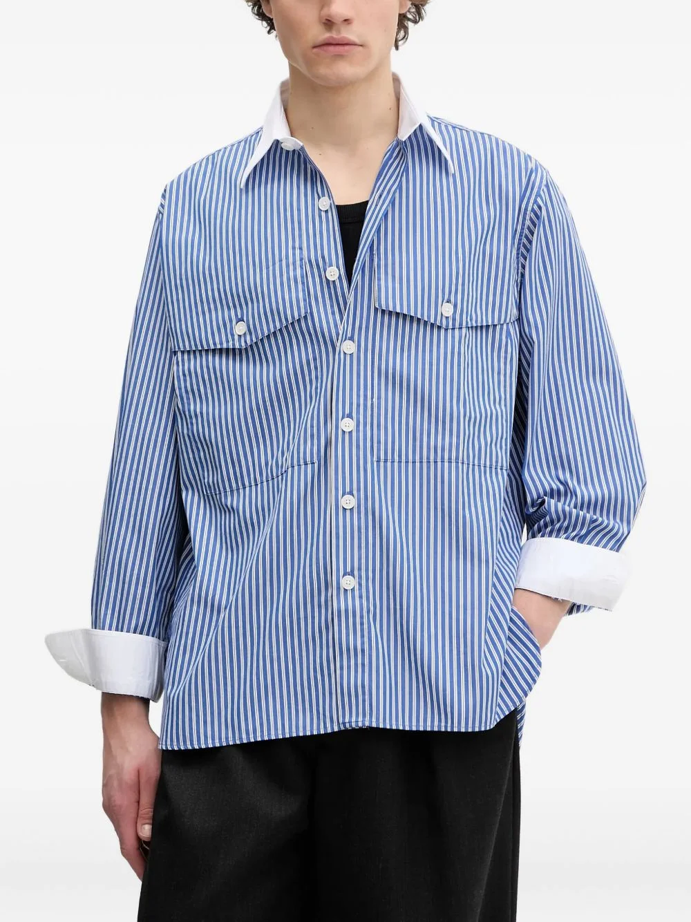 striped shirt Highlights - Blue - Stripe pattern - Pointed collar - Front button fastening - Chest flap pockets - Buttoned cuffs Imported Composition Cotton 100% Washing instructions Read Manufacturer Guidelines