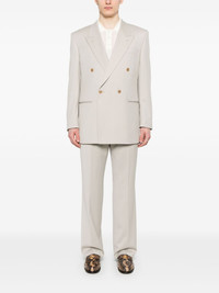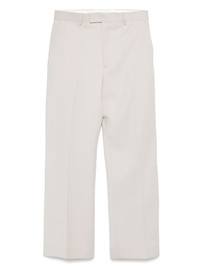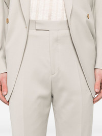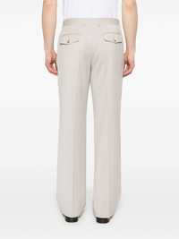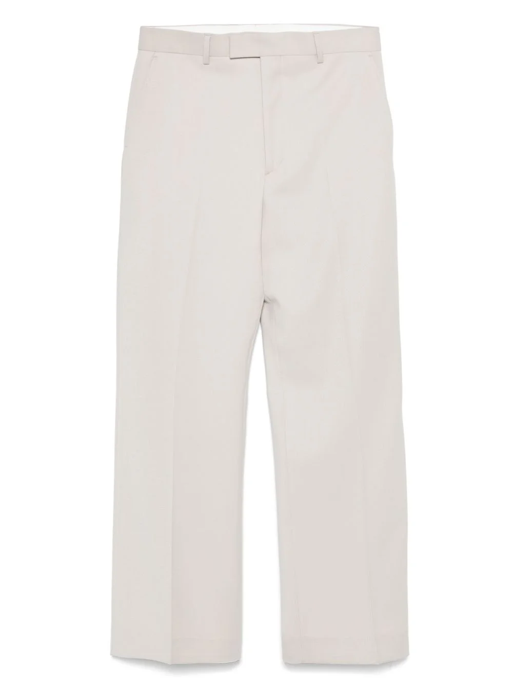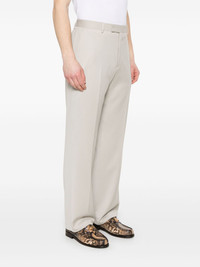 tailored trousers Highlights - Light beige - Concealed front button, hook and zip fastening - Belt loops - Two side slash pockets - Two rear flap pockets Imported Composition Polyester 54%, Wool 44%, Elastane 2% SIZE & FIT Model measurements Height 6 ft 1 in(1.85 m) Bust/Chest 38.18 in(97 cm) Hips 36.61 in(93 cm) Waist 31.49 in(80 cm) FittingInformation Designed for a straight-leg, allowing for an unrestricted and comfortable fit over the leg Made from a midweight stretch fabric, this piece offers elasticity and flexibility when worn