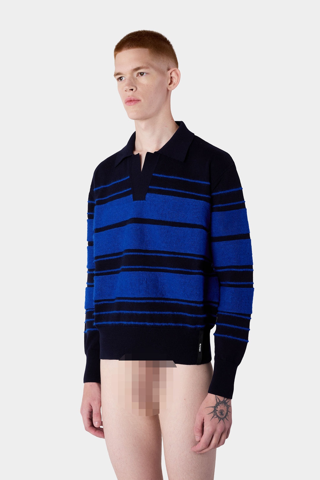 Longsleeve polo in dark blue light extra-fine merino wool with contrast electric blue striped super kid mohair and gros grain SUNNEI logo on side left. 100% WE 70% WMK 30% SE Materials from Portugal Made in Portugal Coretin is wearing a size M. Model measures: Height: 186cm Chest: 87cm Waist: 72cm Hips: 92cm Shoe: 44 Coretin is wearing a size M. Model measures: Height: 186cm Chest: 87cm Waist: 72cm Hips: 92cm Shoe: 44
