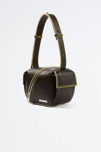 Cubic bag in brown grained calf leather with diagonally cross zipper closure and adjustable shoulder strap. Two side pockets with magnetic closures and inside pocket with zip. Yellow contrast stitching and white logo on the front. Internal canvas finishing.Bag size: 18x14x14 cmShoulder strap length: 95 cm100% LE / 100% CO Material from Italy Made in Italy