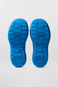 CEMENTO mule shoes in black leather with a chunky textured sole and blue pop color outsole. Exterior: 90% Leather 10%Elastane / Outsole: 100% Thermoplastic Rubber Made in Portugal