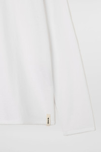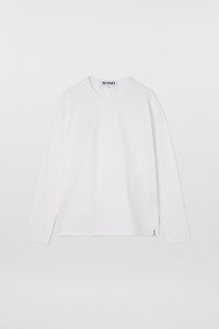 White garment-dyed classic-fit crewneck longsleeve t-shirt featuring piping on collar and hems and SUNNEI gros grain on front bottom left. 100% CO Materials from Portugal Made in Portugal Momo is wearing a size M. Model measures: Height: 187cm Chest: 75cm Waist: 63cm Hips: 85cm Shoe: 43