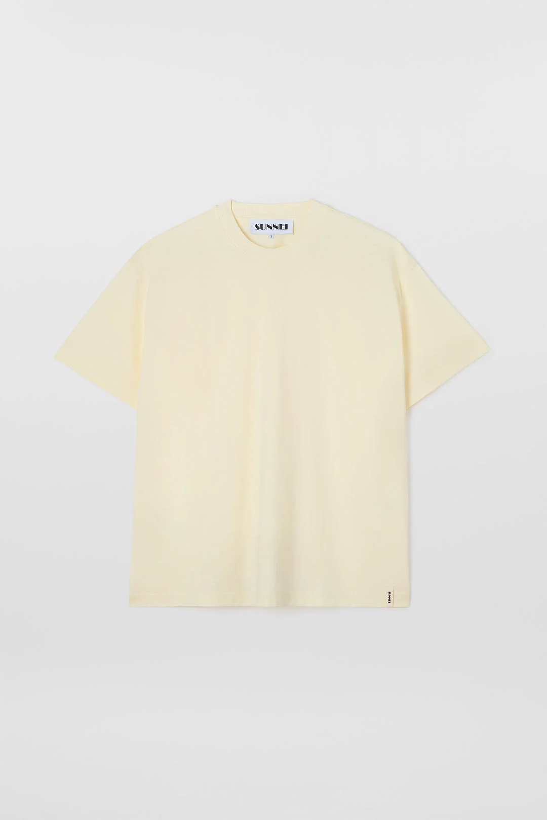 Cream garment-dyed classic fit t-shirt featuring ribbed collar and SUNNEI gros grain on fornt left side. 100% CO Materials from Portugal Made in Portugal