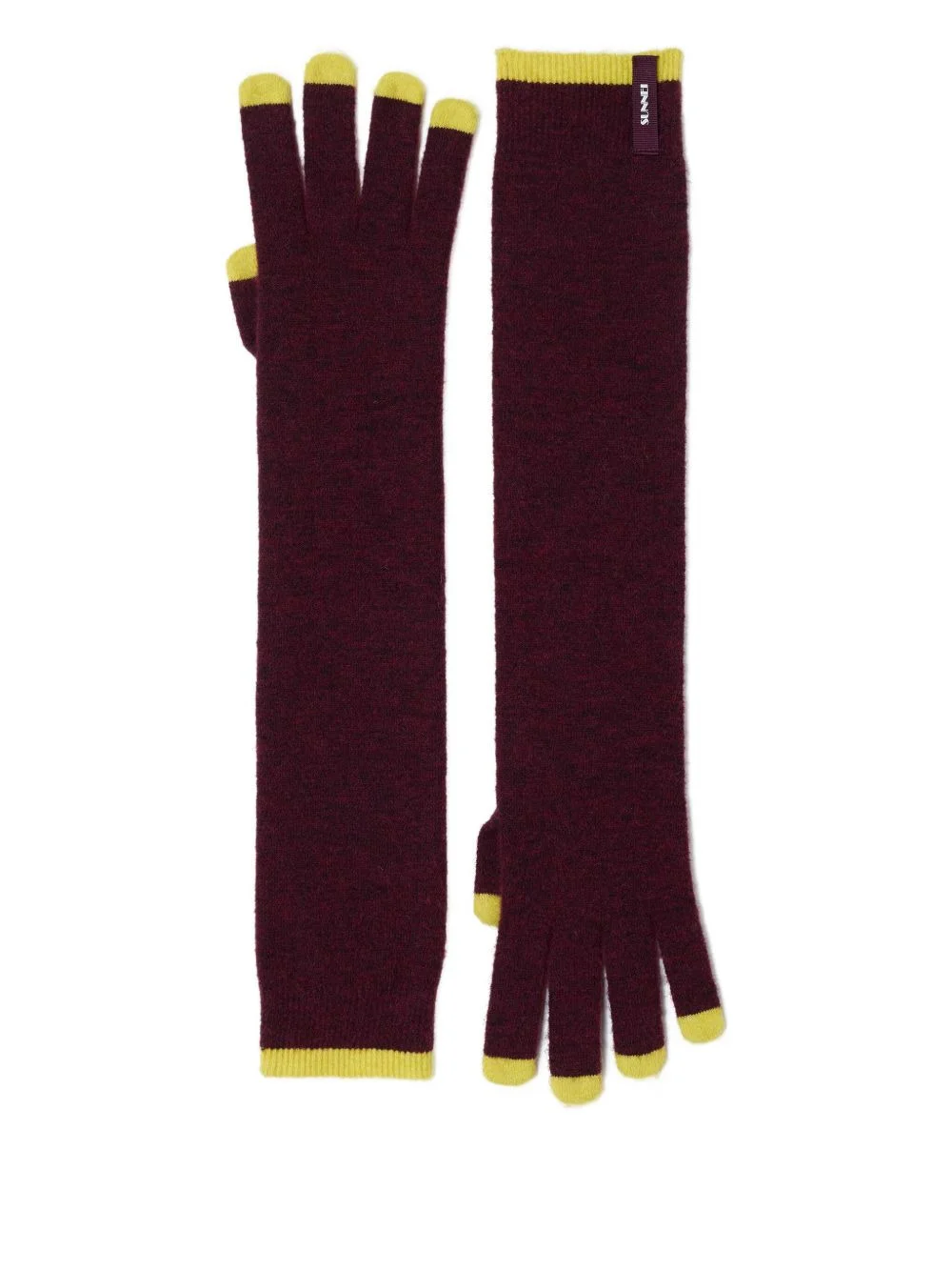 fingerless knit gloves Highlights - Dark red - Knit - Yellow trim - Long length - Ribbed cuffs Imported Composition Polyamide 59%, Viscose 23%, Merino 10%, Cashmere 5%, Elastane 3% Washing instructions Read Manufacturer Guidelines