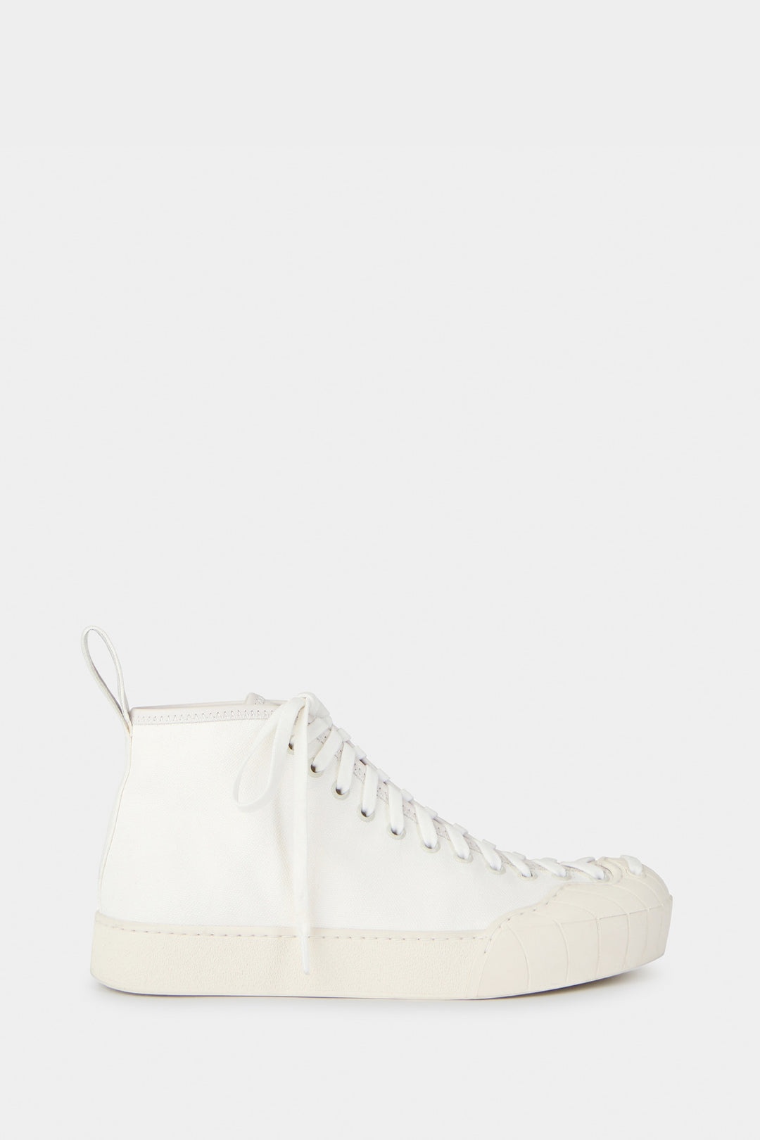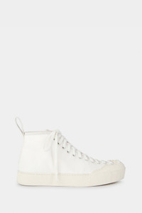 High top white Isi sneakers. White shoe laces closure and white leather binding. Wavy cream rubber toe box and outsole. Upper: 100% CO 100% CALF Lh Sole: 100% EL Materials from Italy Made in Italy