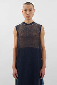 Long over-fit gilet dress in light knit with a mixed mohair yarn featuring SUNNEI embroidery on the bottom left 30%WM 30%WO 40%PA Changmho is wearing a size M. Model measures: Height: 187cm Chest: 84cm Waist: 65cm Hips: 87cm Shoe: 44