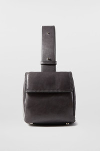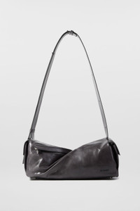 Duffel twisted bag in grey-washed calf leather with cross-bag zipper closure and adjustable shoulder strap. Two side pockets with magnetic closures and debossed logo on front. Internal canvas lining and internal pocket with zip. Bag size: H: 15cm L: 35cm W: 13cm Shoulder strap drop: min 24cm — max 60cm 100% LE / 100% CO Materials from Italy Made in Italy