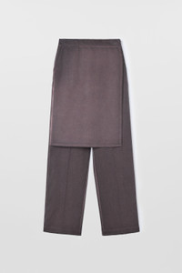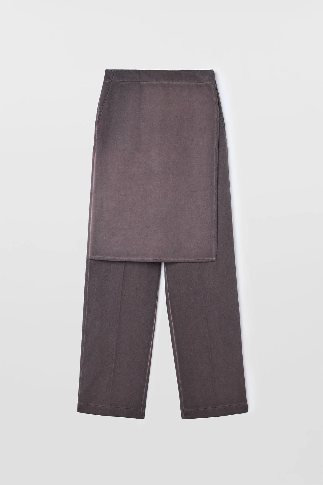 Straight-leg relaxed fit pants featuring a front panel skirt in plum garment dyed wool with snap button closure on the front side left and double back welt pockets. 100% WO Materials from Italy Made in Italy Alessio is wearing a size S. Model measures: Height: 187 cm Chest: 89 cm Waist: 74 cm Hips: 89 cm