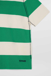 Knitted emerald green & cream striped polo shirt with linked external chain stitches and contrast collar, SUNNEI logo embroidery on bottom left. Lighter cotton for a better performance in Spring Summer. 100% COMBED COMPACT COTTON Etienne is wearing a size M. Model measures: Height: 188cm Chest: 92cm Waist: 75cm Hips: 86cm Shoe: 44