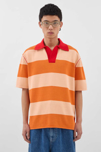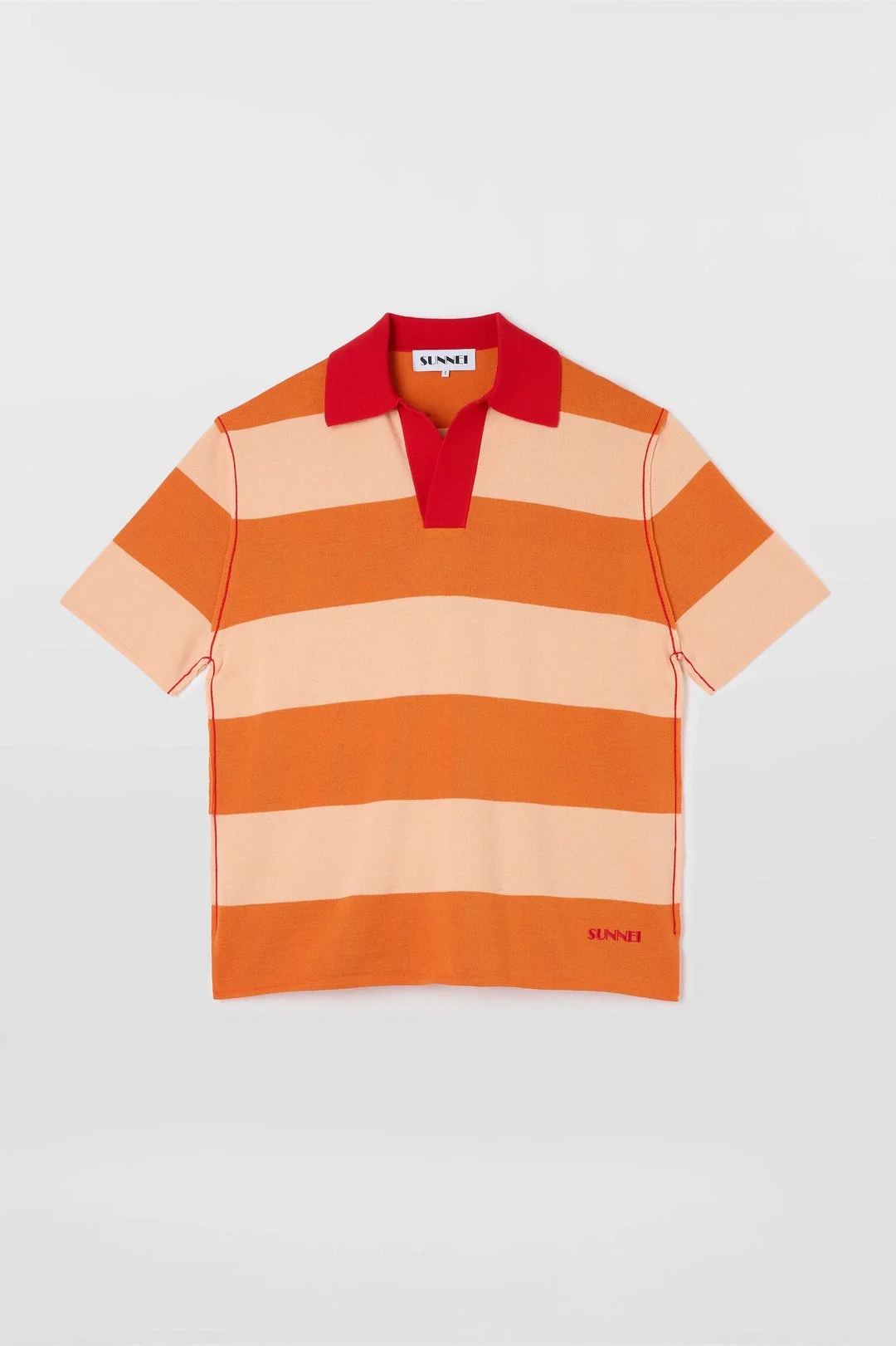 Knitted orange and salmon pink striped polo shirt with linked external chain stitches and contrast collar, SUNNEI logo embroidery on bottom left. Lighter cotton for a better performance in Spring Summer. 100% COMBED COMPACT COTTON Junseo is wearing a size M. Model measures: Height: 188cm Chest: 89cm Waist: 71cm Hips: 92cm Shoe: 42