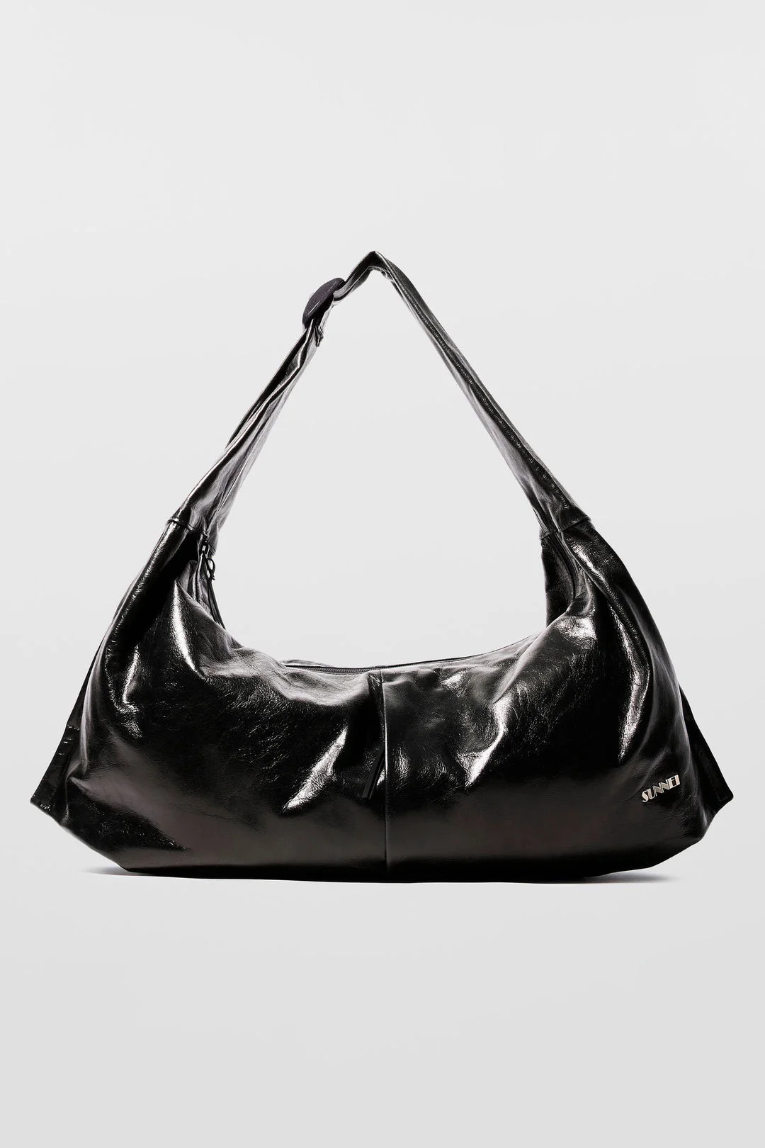 Shiny black leather bag with adjustable shoulder strap, external zipped pocket and top zip closure. Bag size: W: 65cm D: 12 cm H: 34 cm Straps drop: min 30cm — max 50cm 100% LH Materials from Italy Made in Italy 100% LH Materials from Italy Made in Italy